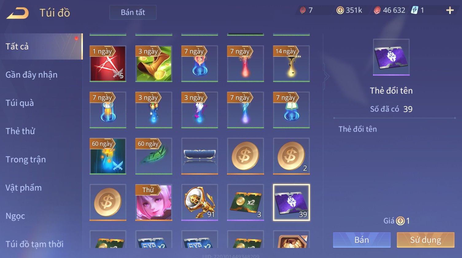 Trạng Thái: Nick có SĐT or Gmail Của Shop( Có Thể Thay Đổi)