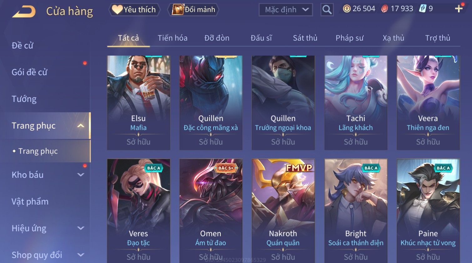 Nổi bật: Skin: Raz Gon×Capheny Tử Đinh Hương×Quillen Đặc Công Mãng Xà×Elsu Trấn Thiên Phi Hồ×Liliana Nguyệt Mị Ly×Aya Mc Sóc Nhỏ×Grakk Đi Vào Lòng Đất×Charlotte