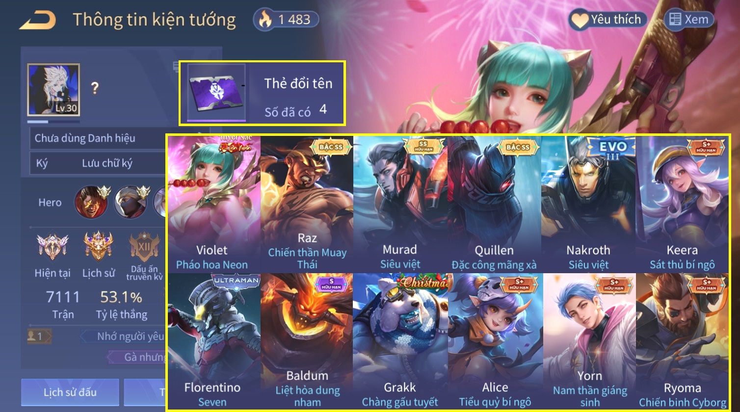 Nổi bật: Skin: Yan Tanjiro Kamado×Keera Nezuko Kamado×Airi Bích Hải×Lauriel Tinh Vân Sứ×Veres Kimono×Capheny Kimono×Quillen Đặc Công Mãng Xà×Ngộ Không Siêu Việt×Omen Đao Phủ Tận Thế×Raz Siêu Việt×Florentino Giám Sát Tinh Hệ×