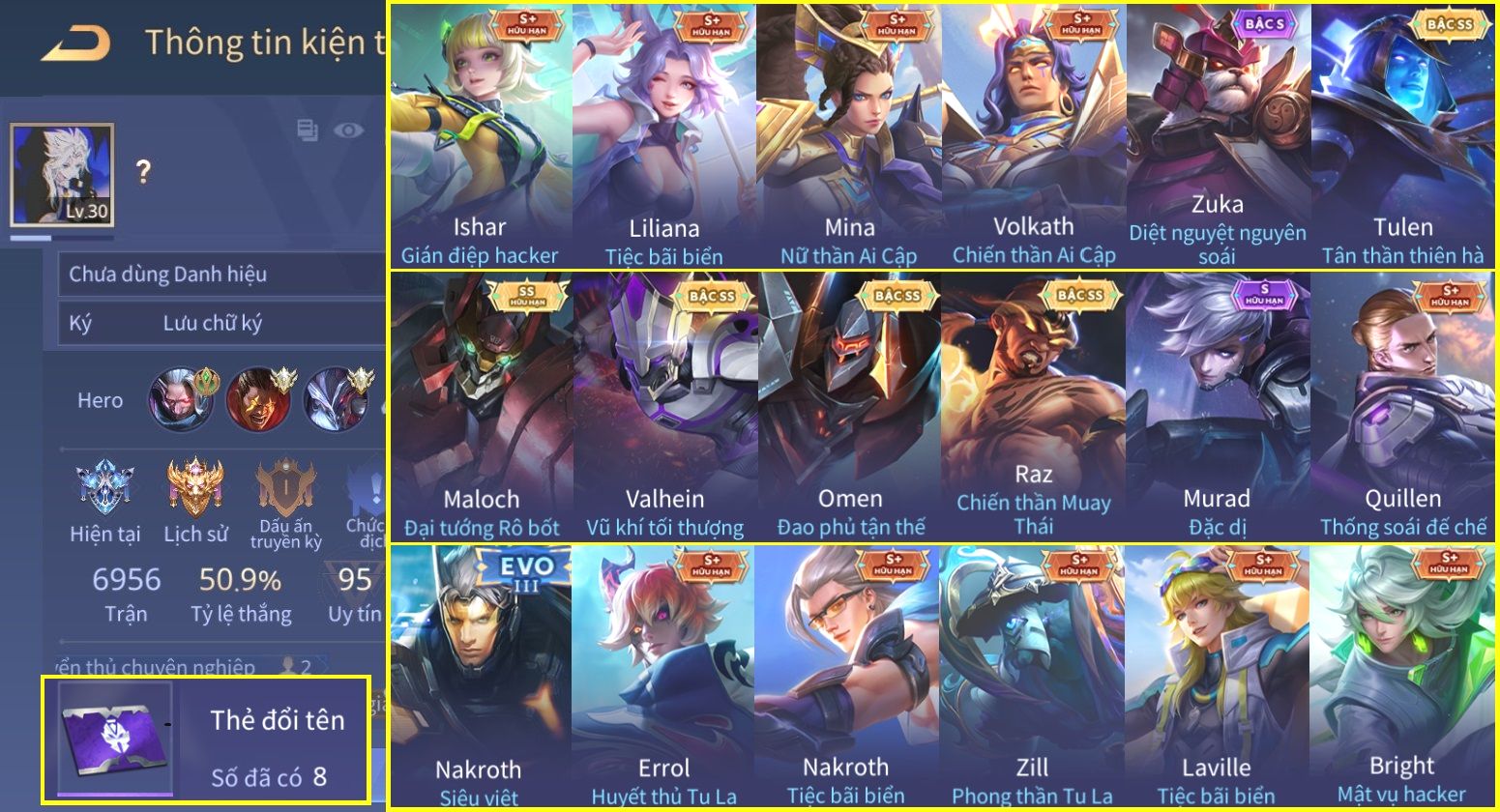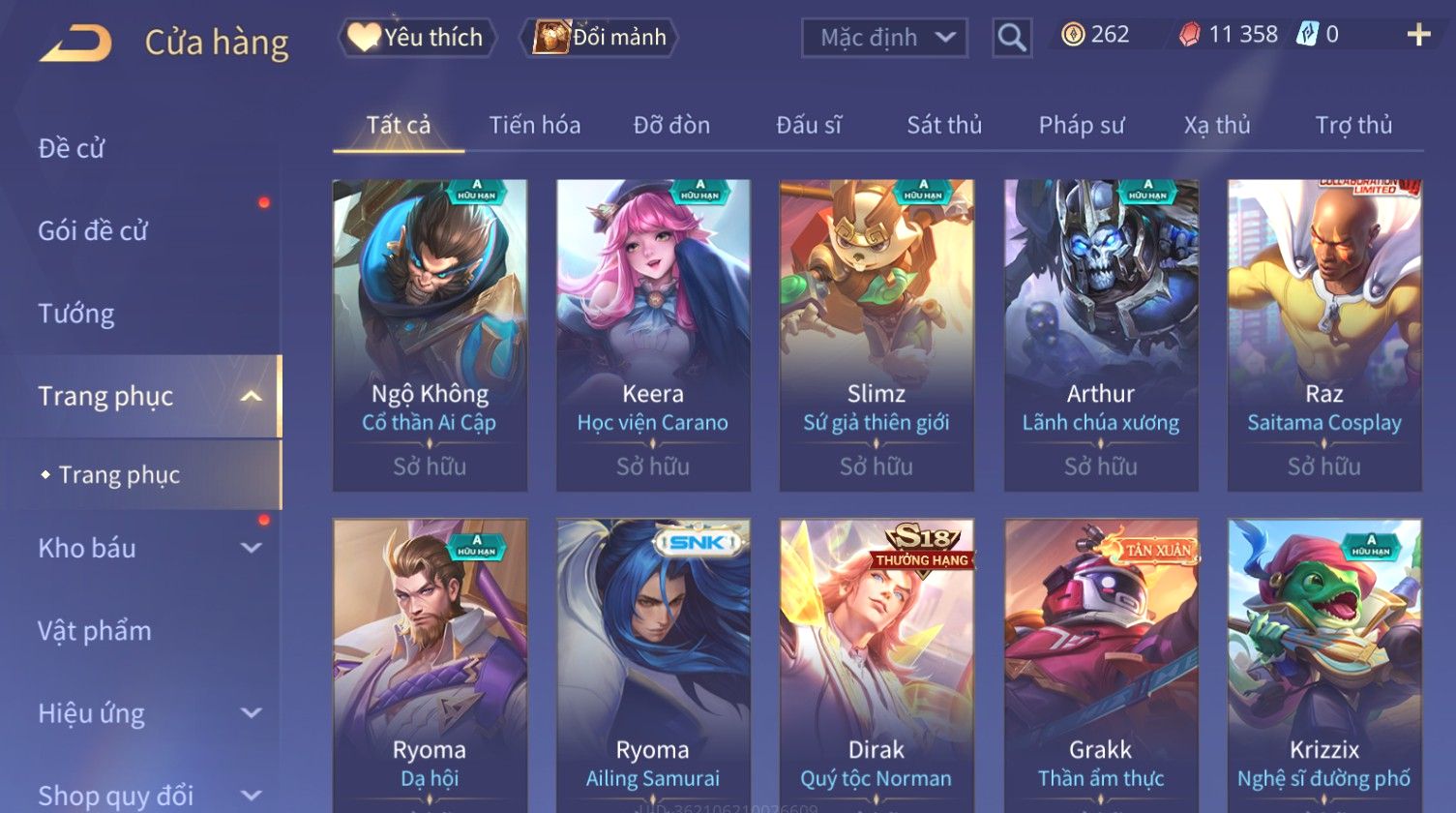 Nổi bật: Skin: Raz Chiến Thần Muay Thái×Maloch Đại Tướng Rô Bốt×Valhein Vũ Khí Tối Thượng×Omen Đao Phủ Tận Thế×Murad Đặc Dị×Quillen Thống Soái Đế Chế×Full Ngọc, Nhiều Skin SS Đẹp