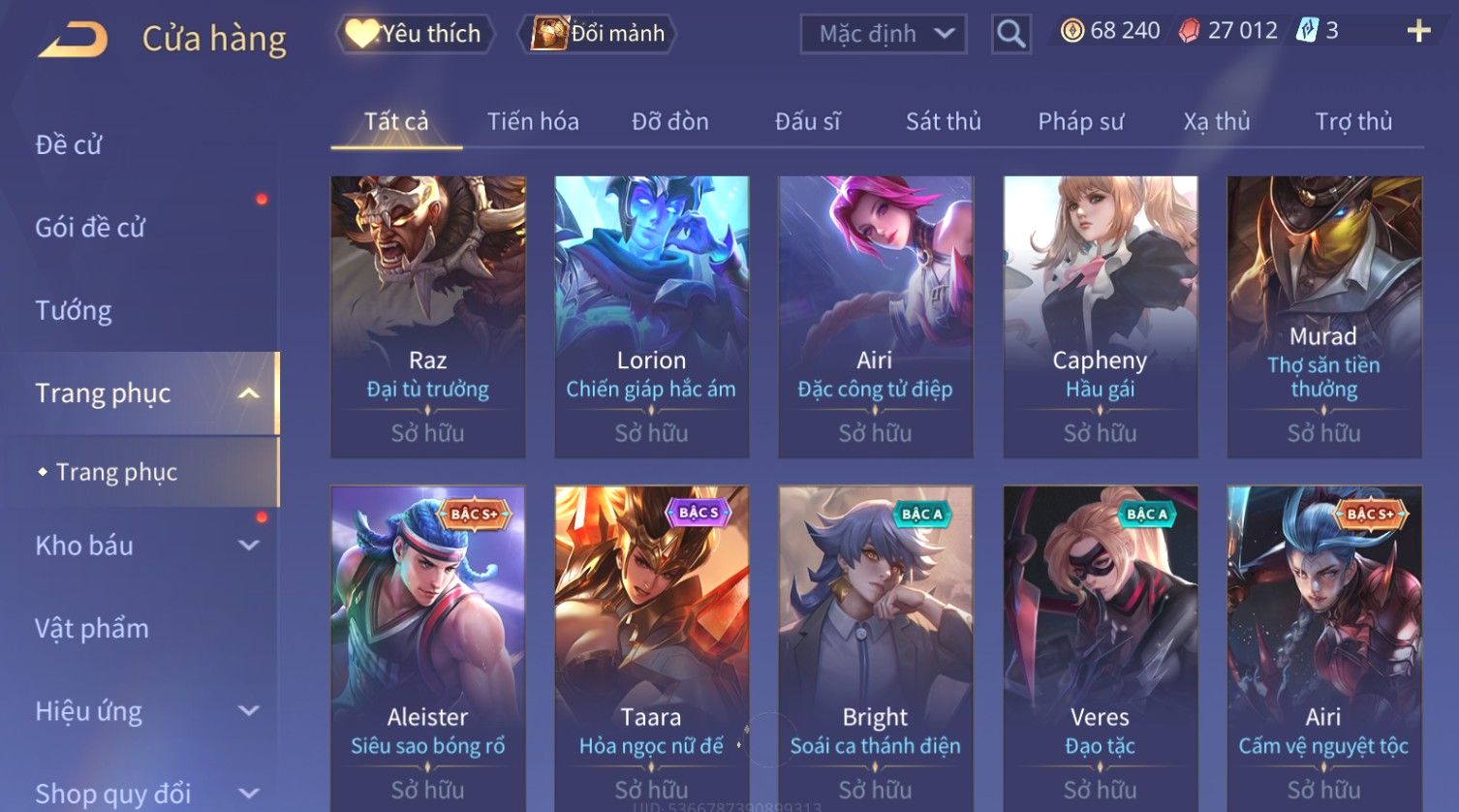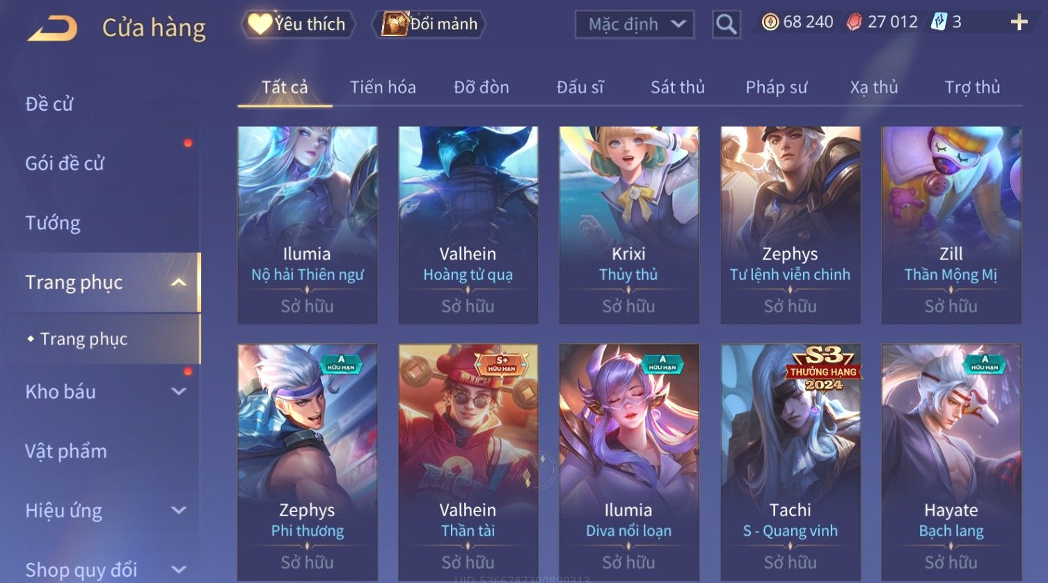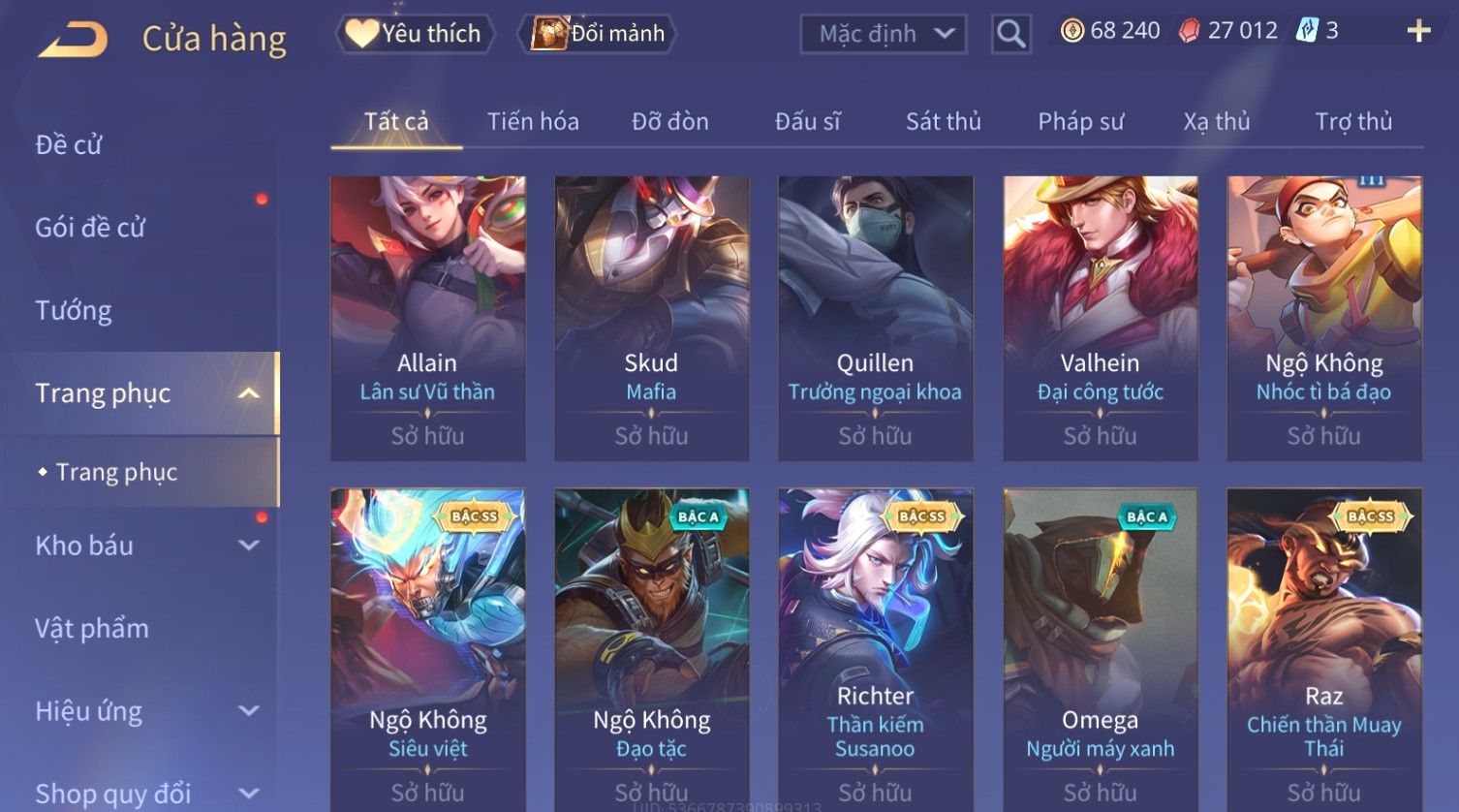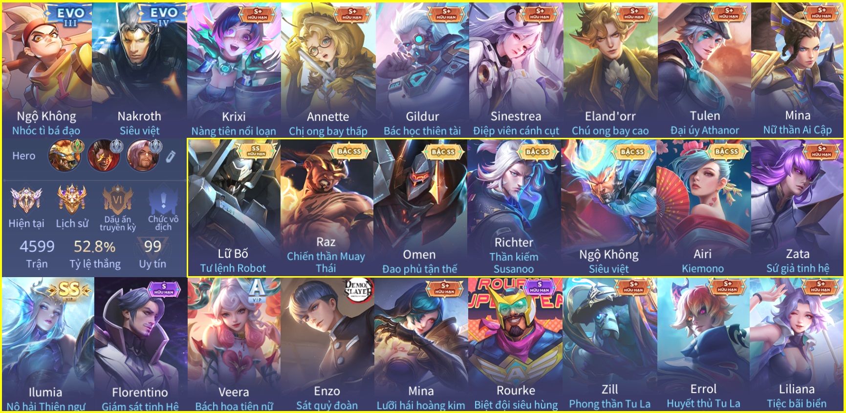 Nổi bật: Skin: Lữ Bố Tư Lệnh Robot×Raz Chiến Thần Muay Thái×Omen Đao Phủ Tận Thế×Richter Thần Kiếm Susanoo×Ngộ Không Siêu Việt×Zata Sứ Giả Tinh Hệ×Airi Kiemono×Florentino Giám Sát Tinh Hệ×Ilumia Nộ Hải Thiên Ngư×Full Ngọc, Nhiều Skin SS Đẹp