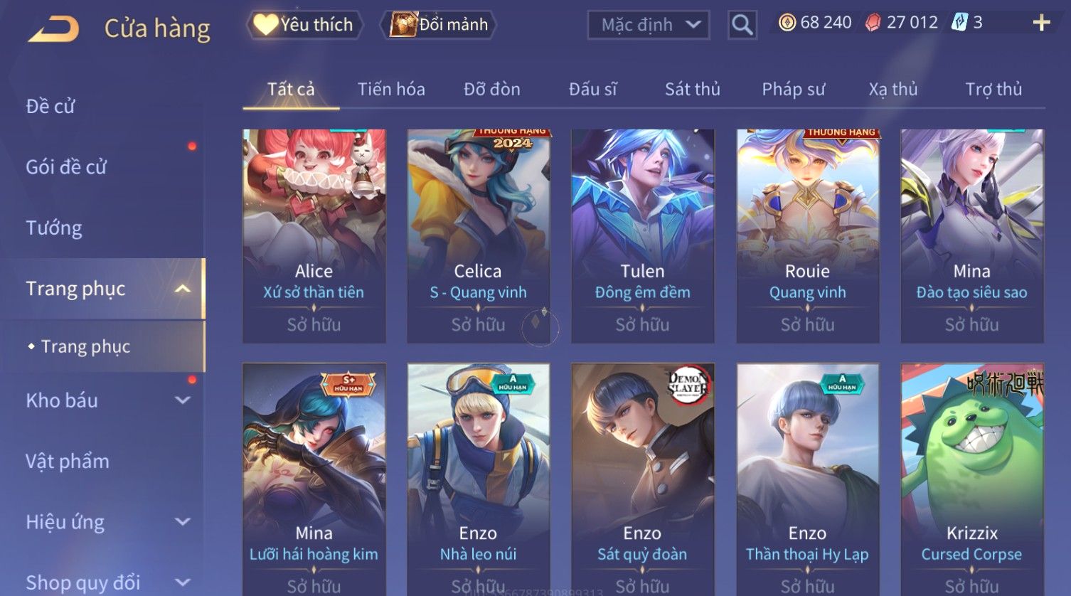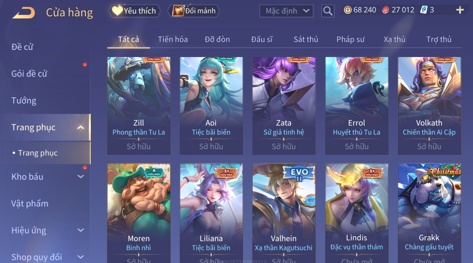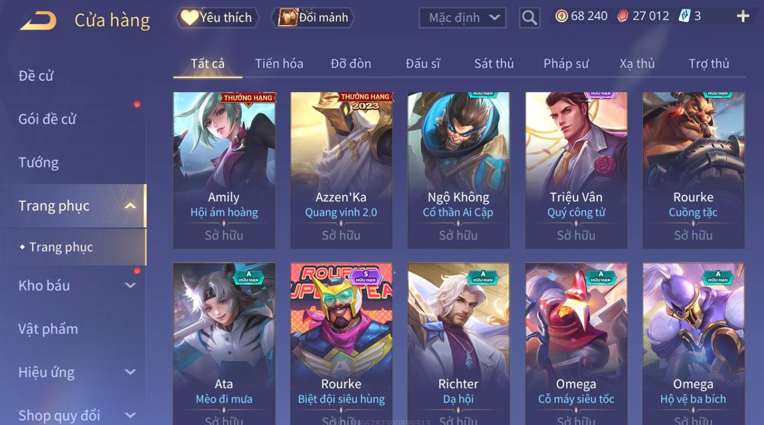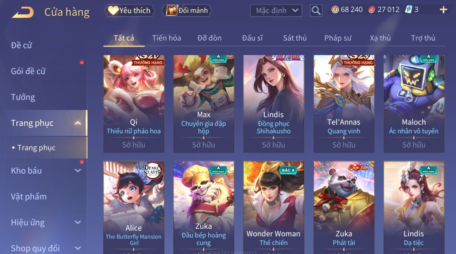Nổi bật: Skin: Lữ Bố Tư Lệnh Robot×Raz Chiến Thần Muay Thái×Omen Đao Phủ Tận Thế×Richter Thần Kiếm Susanoo×Ngộ Không Siêu Việt×Zata Sứ Giả Tinh Hệ×Airi Kiemono×Florentino Giám Sát Tinh Hệ×Ilumia Nộ Hải Thiên Ngư×Full Ngọc, Nhiều Skin SS Đẹp