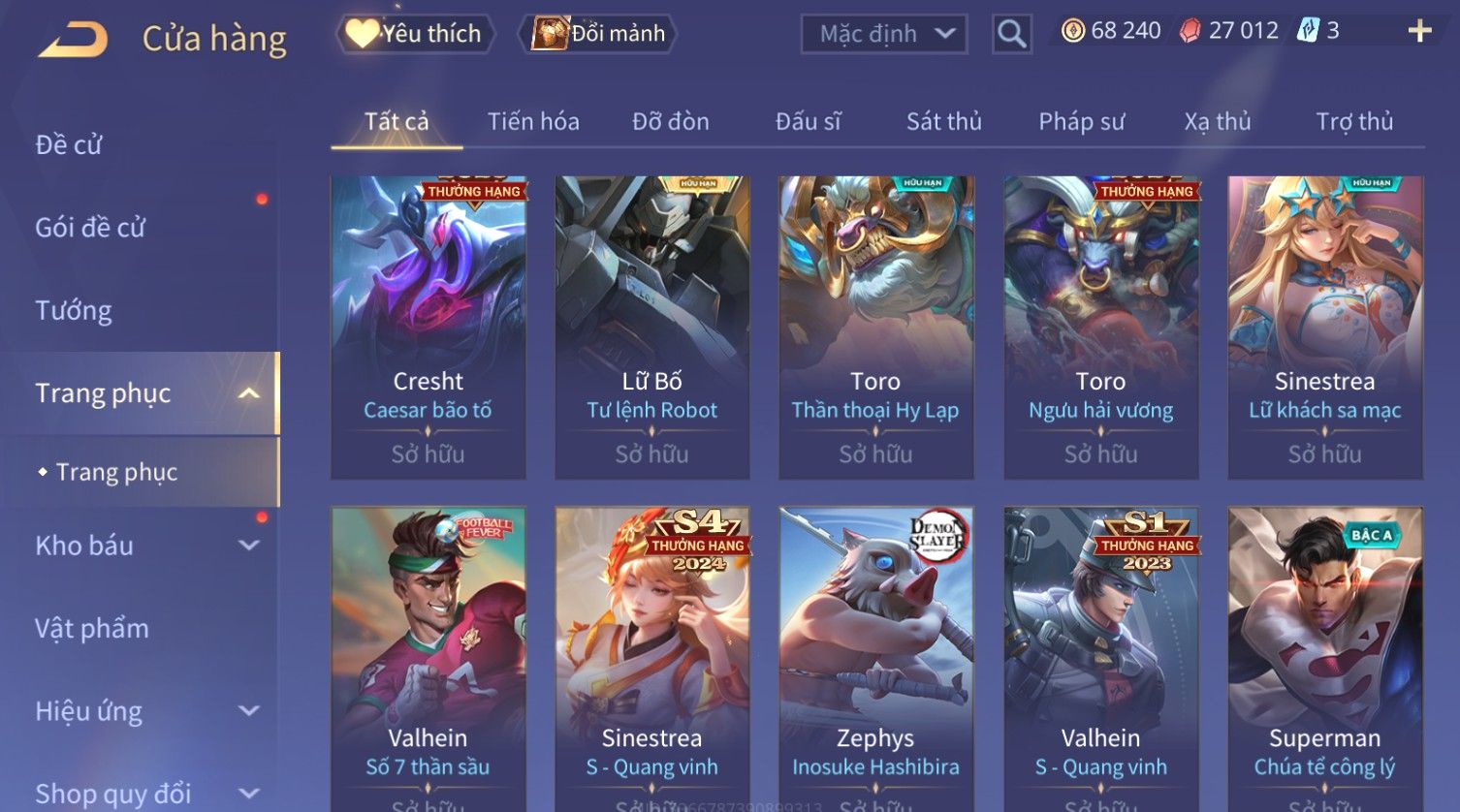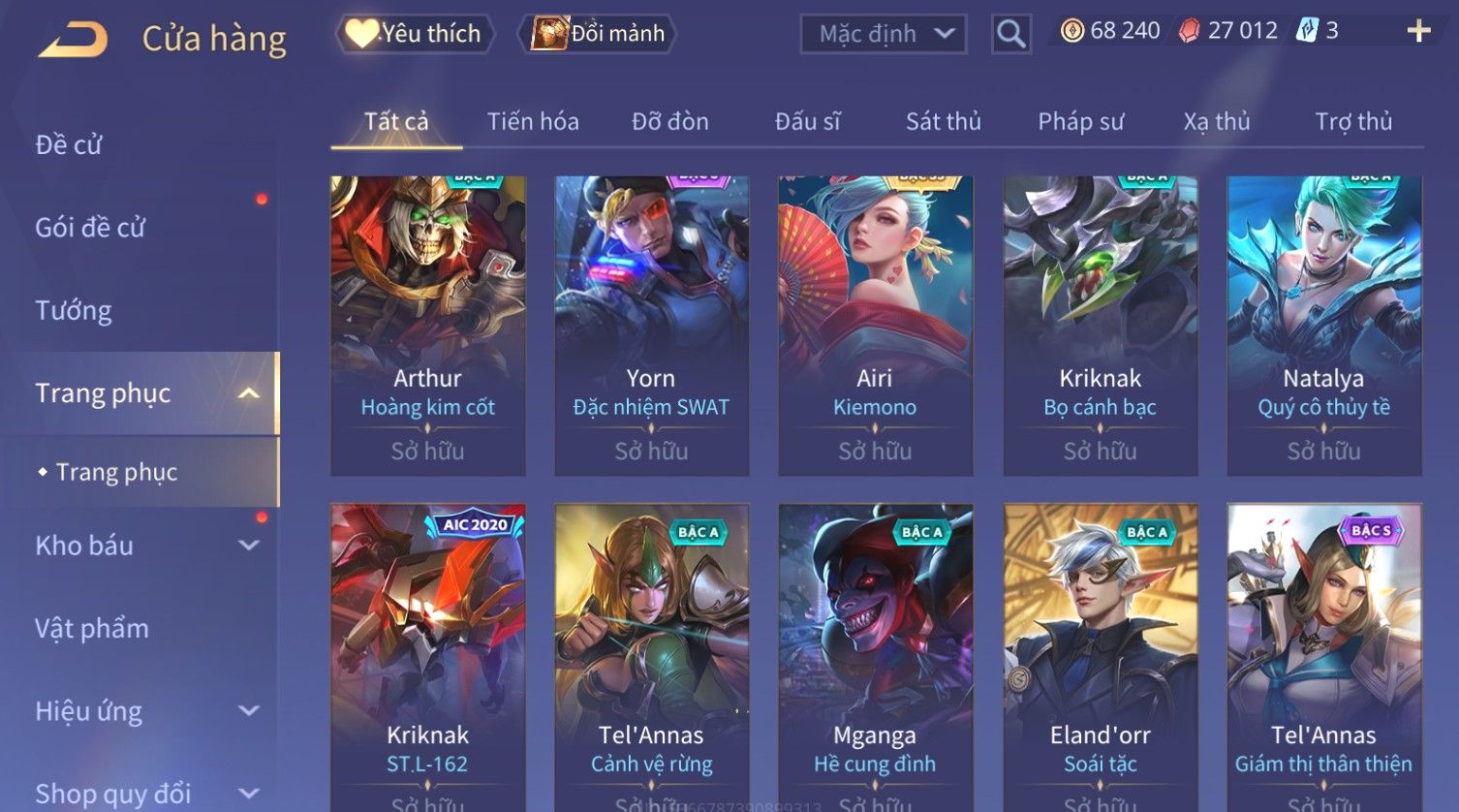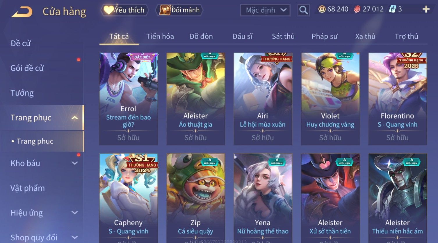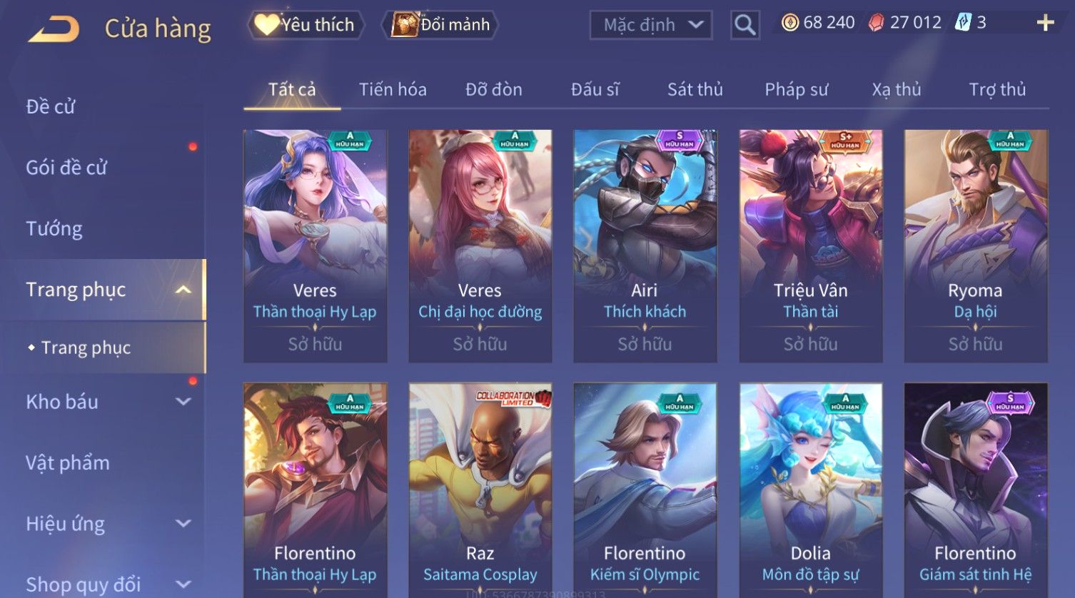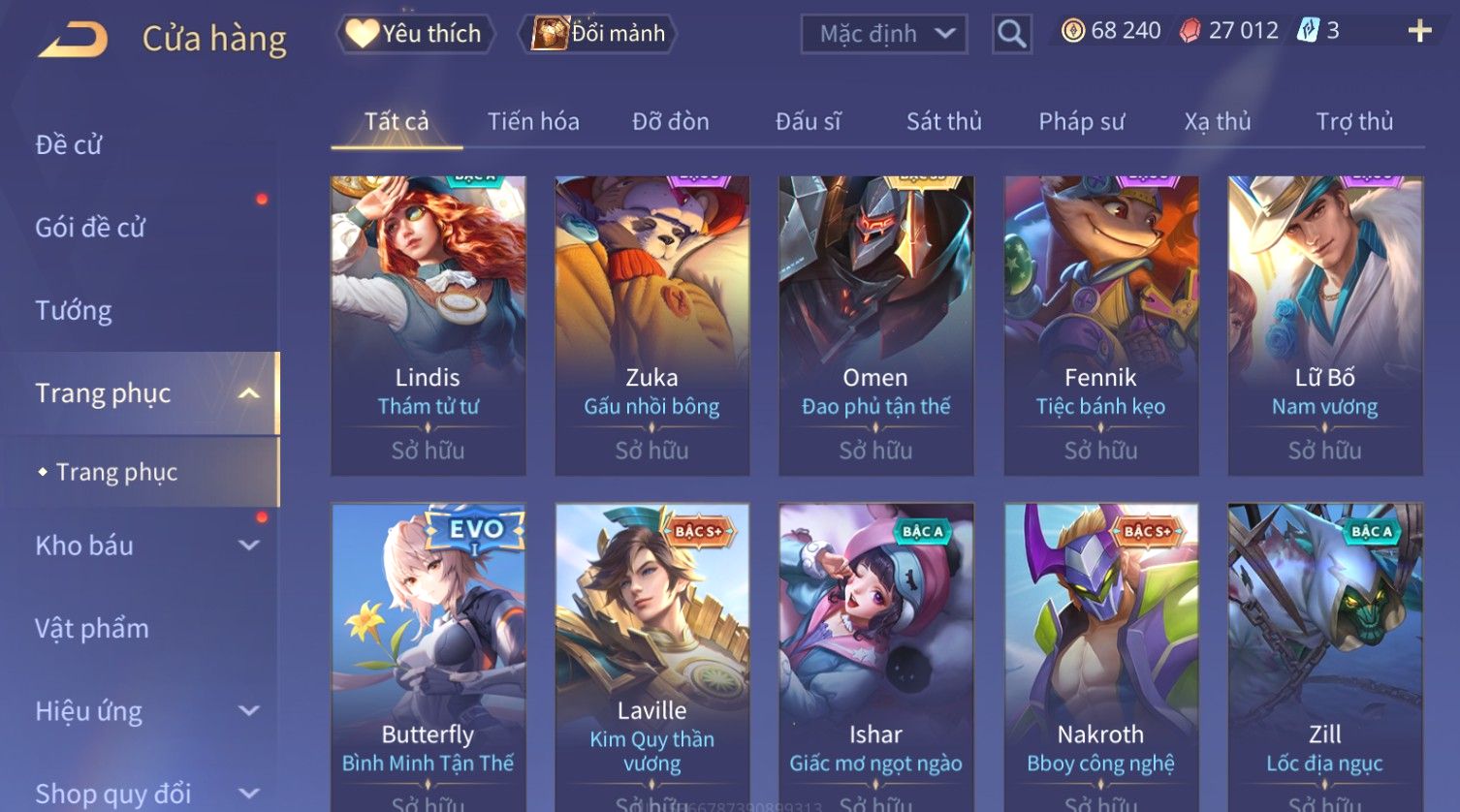 Nổi bật: Skin: Lữ Bố Tư Lệnh Robot×Raz Chiến Thần Muay Thái×Omen Đao Phủ Tận Thế×Richter Thần Kiếm Susanoo×Ngộ Không Siêu Việt×Zata Sứ Giả Tinh Hệ×Airi Kiemono×Florentino Giám Sát Tinh Hệ×Ilumia Nộ Hải Thiên Ngư×Full Ngọc, Nhiều Skin SS Đẹp