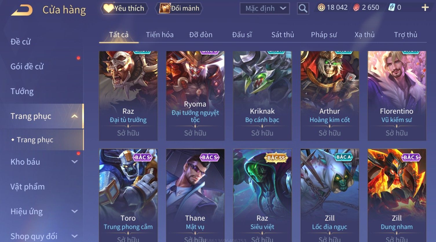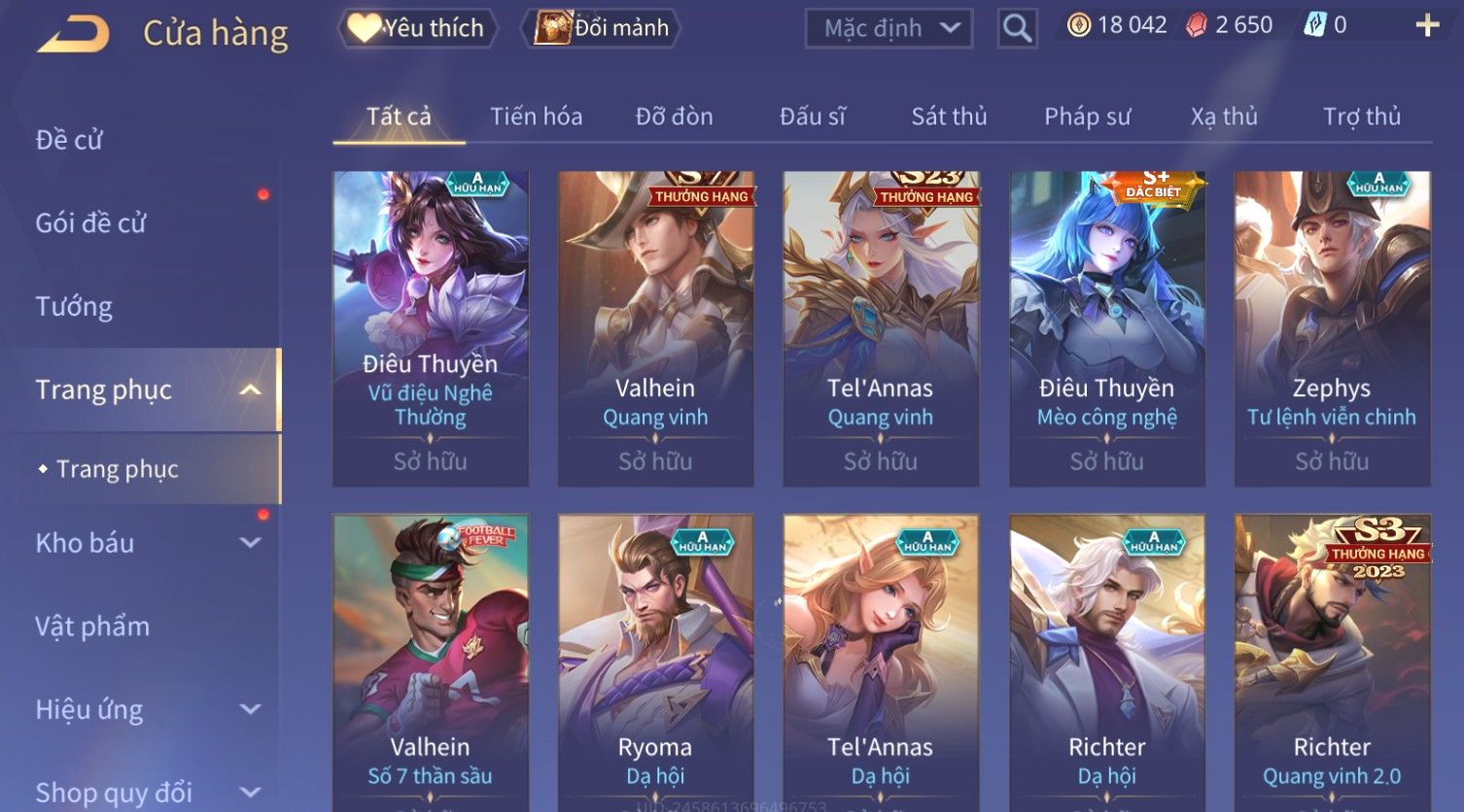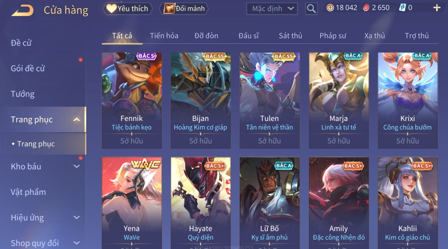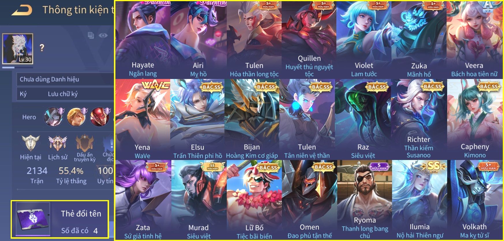Nổi bật: Skin: Yena WaVe×Elsu Trấn Thiên Phi Hồ×Bijan Hoàng Kim Cơ Giáp×Tulen Tân Niên Vệ Thần×Raz Siêu Việt×Richter Thần Kiếm Susanoo×Capheny Kimono×Zata Sứ Giả Tinh Hệ×Ryoma Thanh Long Bang Chủ×Ilumia Nộ Hải Thiên Ngư×Omen Đao Phủ Tận Thế×Full Ngọc, Nhiều Skin SS Đẹp