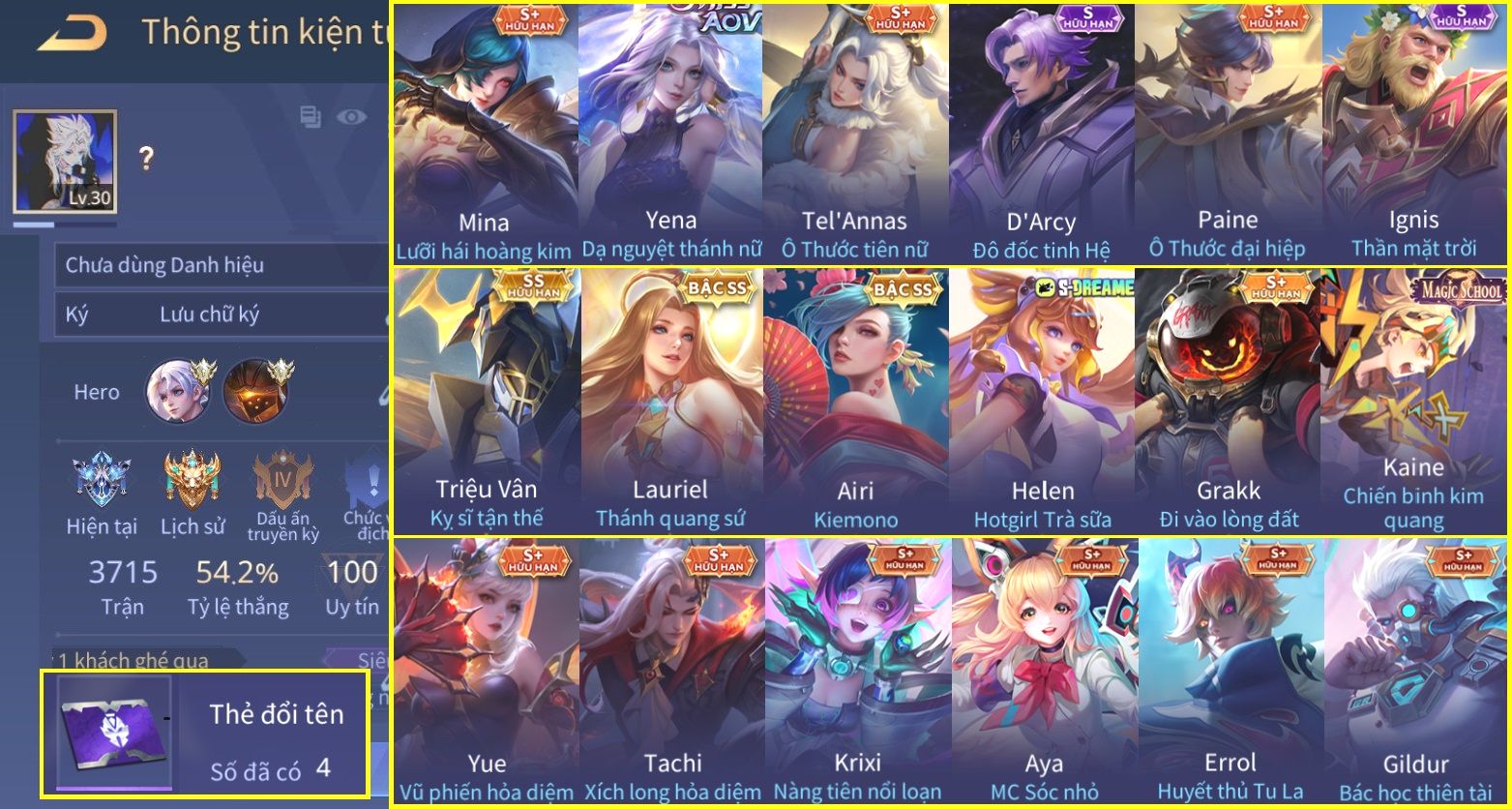 Nổi bật: Skin: Triệu Vân Kỵ Sĩ Tận Thế×Lauriel Thánh Quang Sứ×Airi Kiemono×Grakk Đi Vào Lòng Đất×Aya Mc Sóc Nhỏ×Full Ngọc, Nhiều Skin SS Đẹp