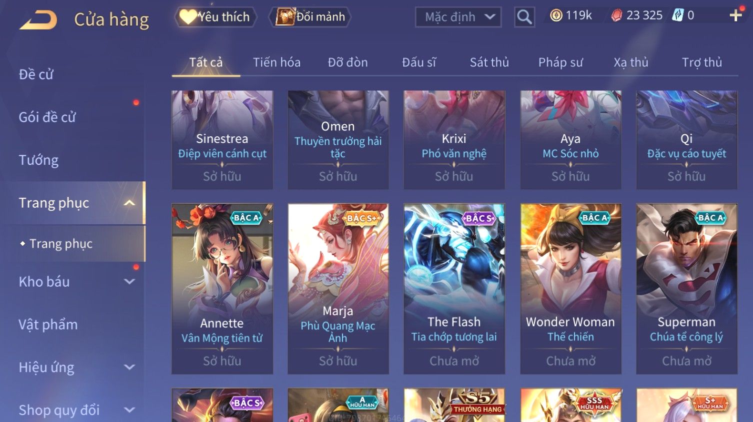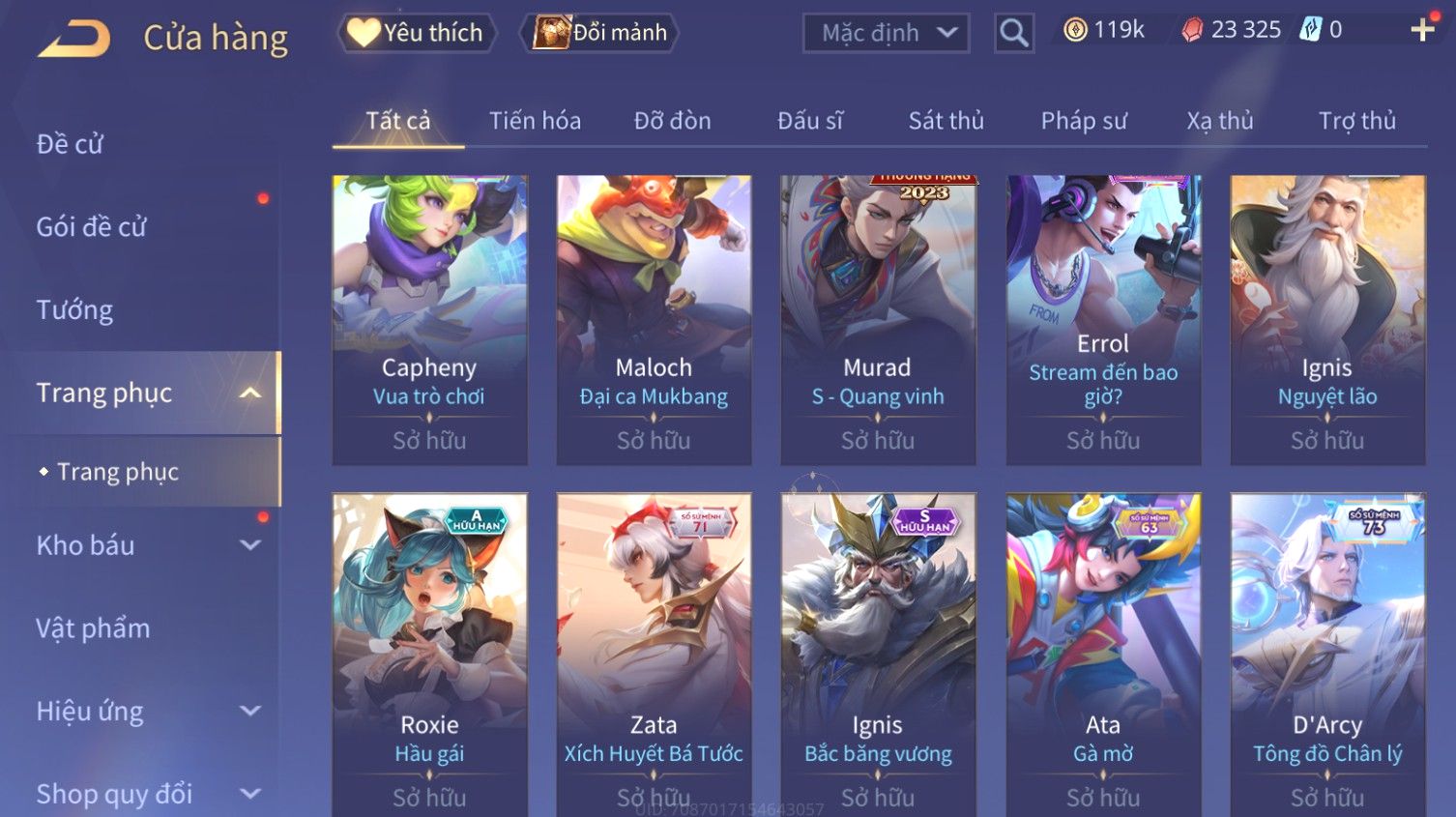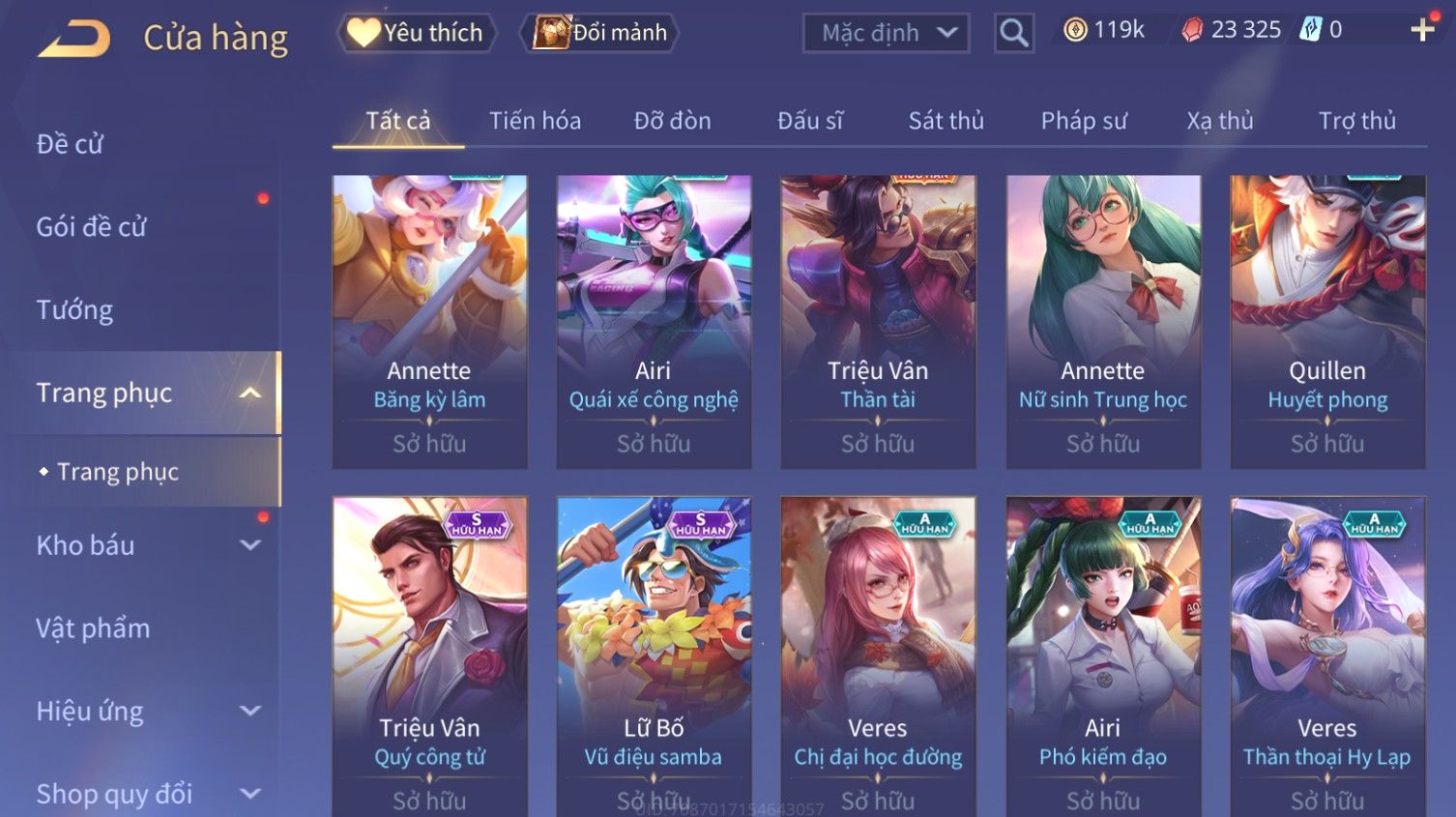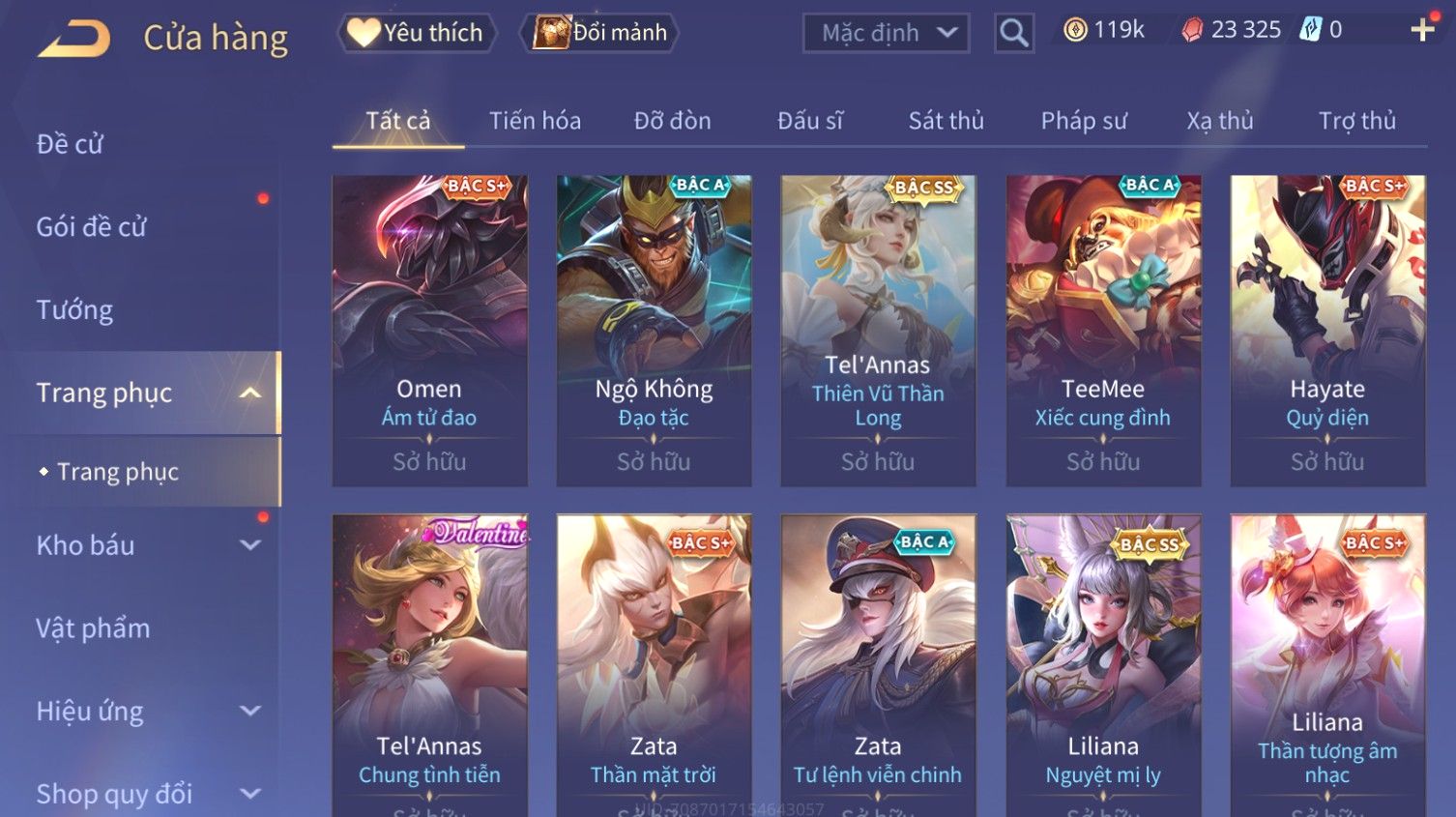Nổi bật: Skin: Butterfly Kim Ngư Thần Nữ×Tel'Annas Thiên Vũ Thần Long×Điêu Thuyền Thất Tịch Tiên Tử×Quillen Đặc Công Mãng Xà×Capheny Tử Đinh Hương×Florentino Giám Sát Tinh Hệ×Aya Mc Sóc Nhỏ×Full Ngọc, Nhiều Skin SS Đẹp