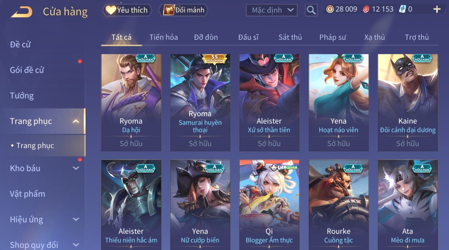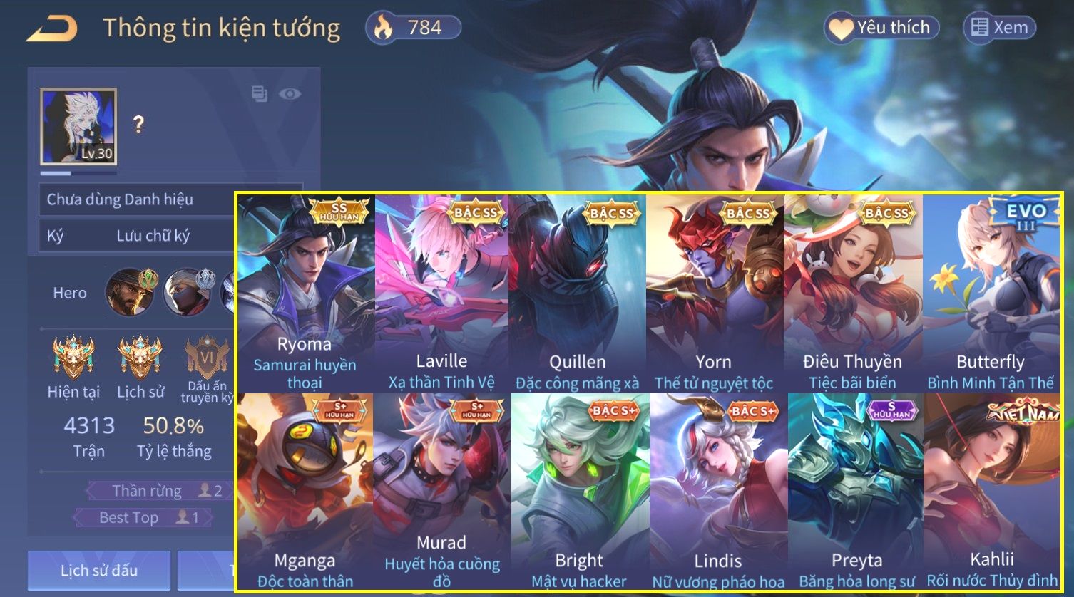Nổi bật: Skin: Ryoma Sumarai Huyền Thoại×Laville Xạ thần Tinh Vệ×Quillen Đặc Công Mãng Xà×Full Ngọc, Nhiều Skin SS Đẹp