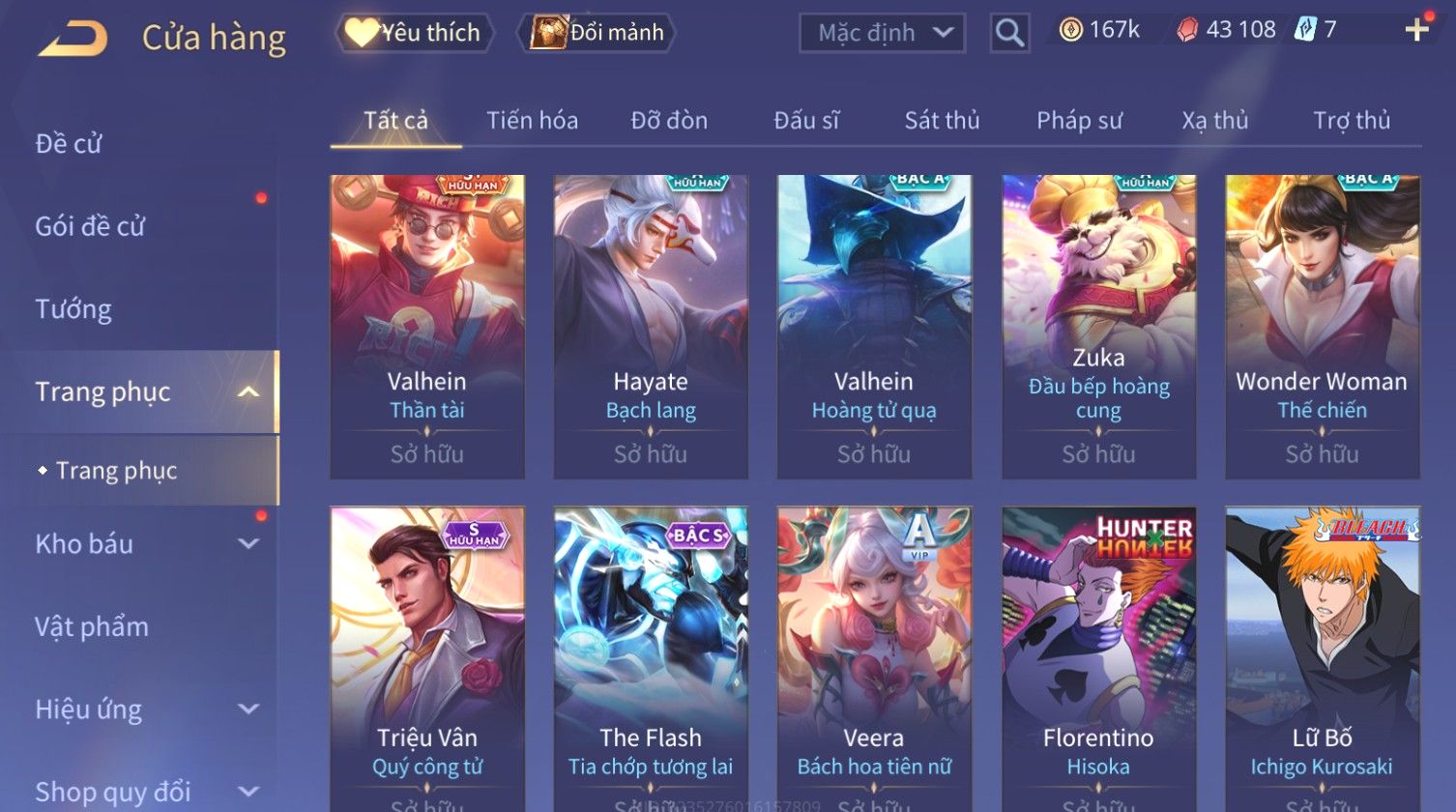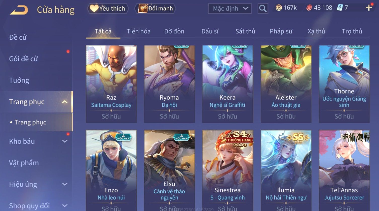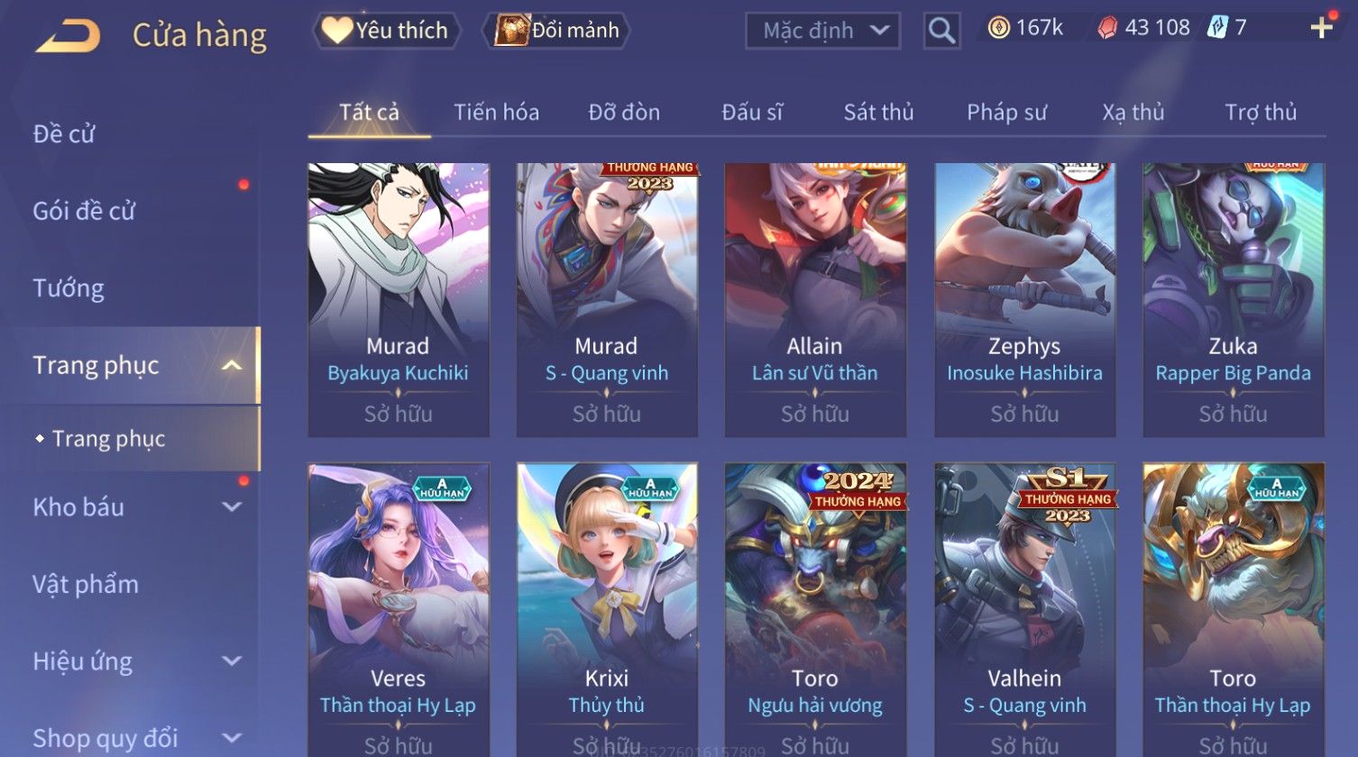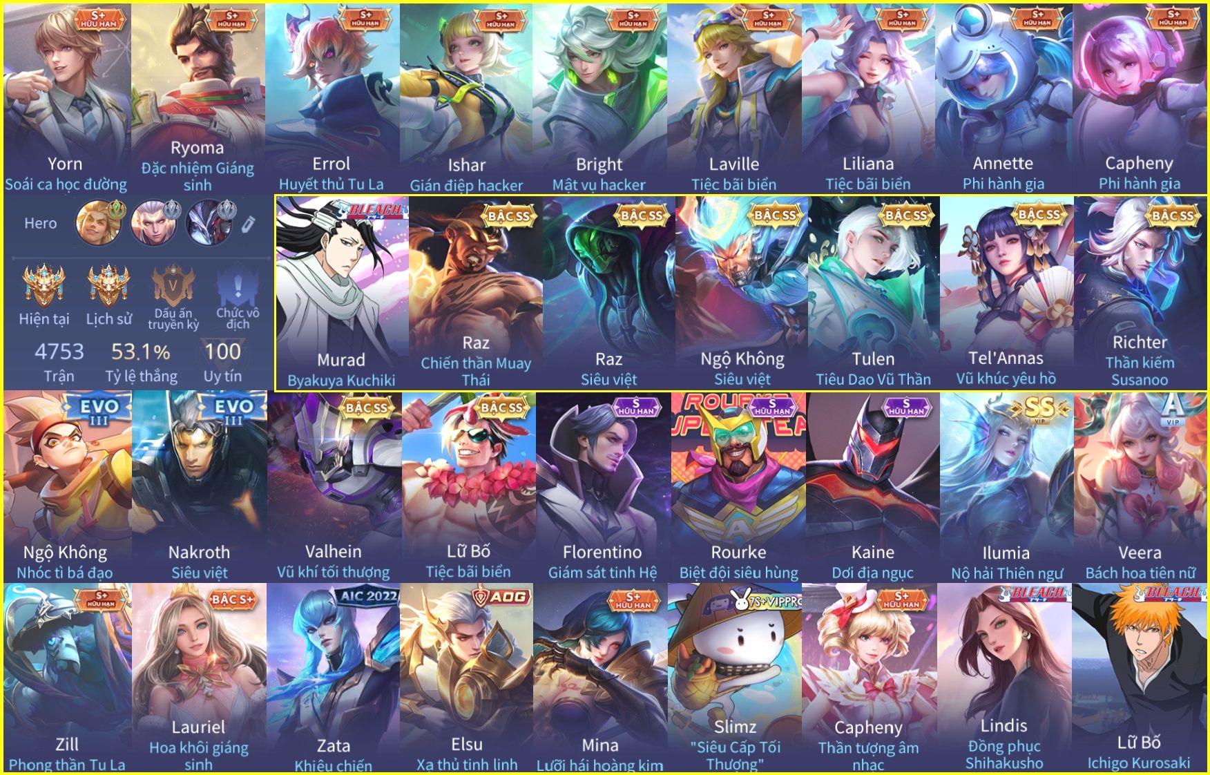 Nổi bật: Skin: Murad Byakuya Kuchiki×Raz Chiến Thần Muay Thái×Raz Siêu Việt×Ngộ Không Siêu Việt×Tulen Tiêu Dao Vũ Thần×Tel'Annas Vũ Khúc Yêu Hồ×Valhein Vũ Khí Tối Thượng×Richter Thần Kiếm Susanoo×Florentino Giám Sát Tinh Hệ×Full Ngọc, Nhiều Skin SS Đẹp