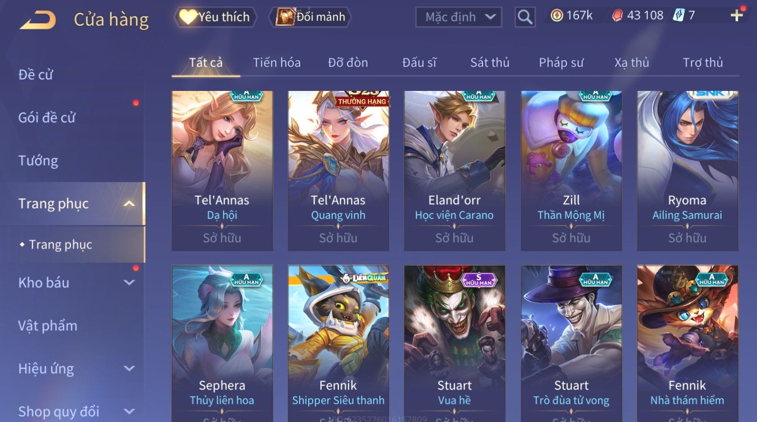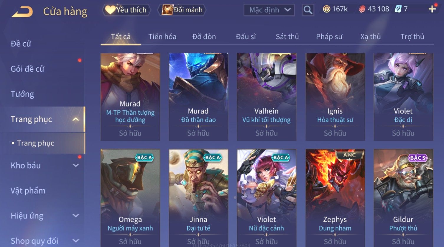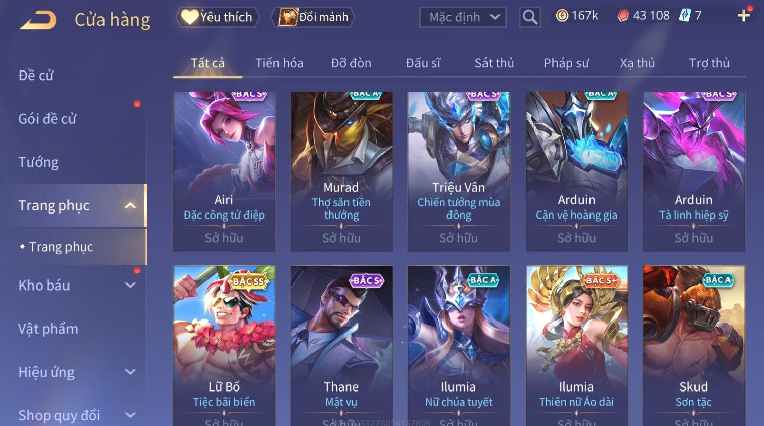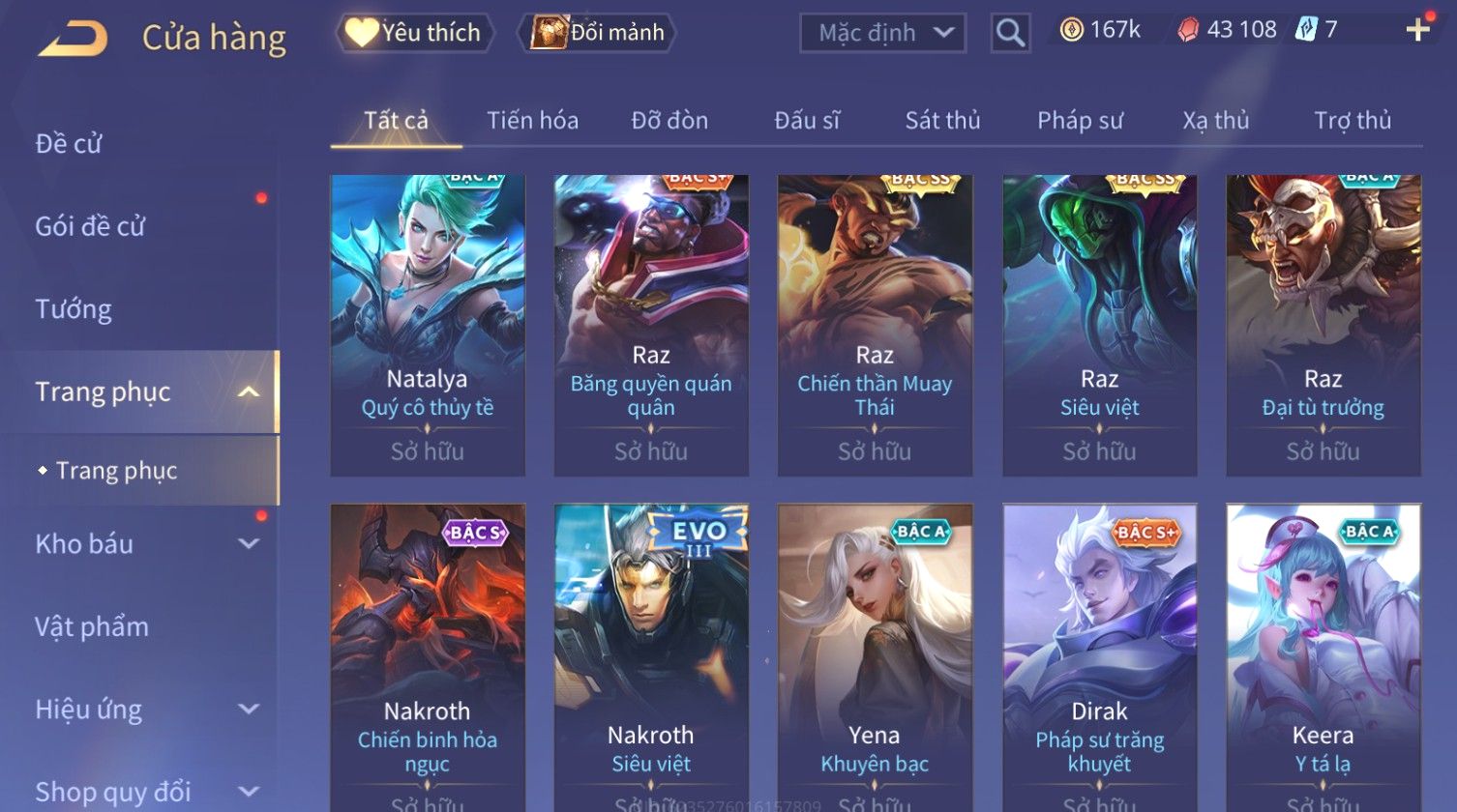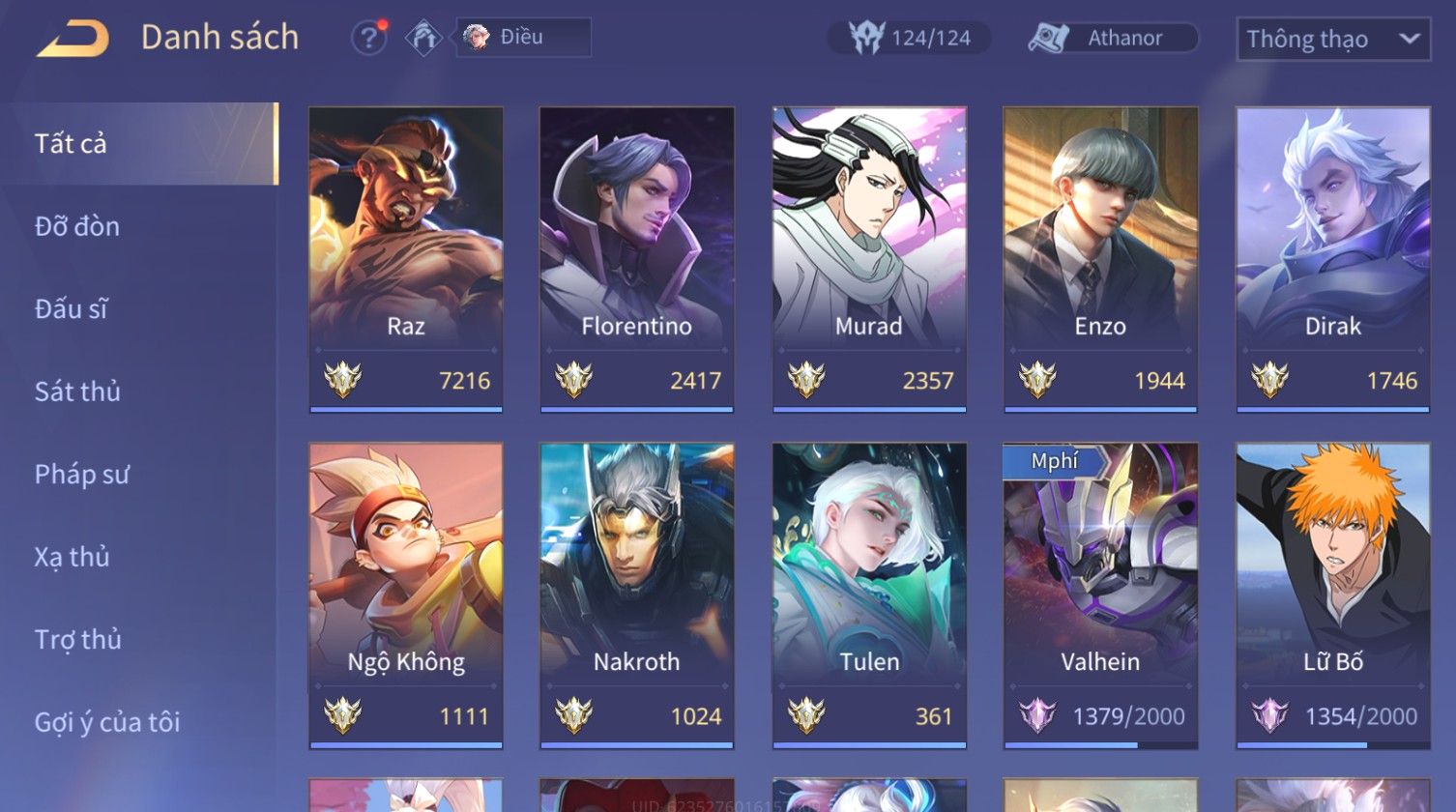 Nổi bật: Skin: Murad Byakuya Kuchiki×Raz Chiến Thần Muay Thái×Raz Siêu Việt×Ngộ Không Siêu Việt×Tulen Tiêu Dao Vũ Thần×Tel'Annas Vũ Khúc Yêu Hồ×Valhein Vũ Khí Tối Thượng×Richter Thần Kiếm Susanoo×Florentino Giám Sát Tinh Hệ×Full Ngọc, Nhiều Skin SS Đẹp