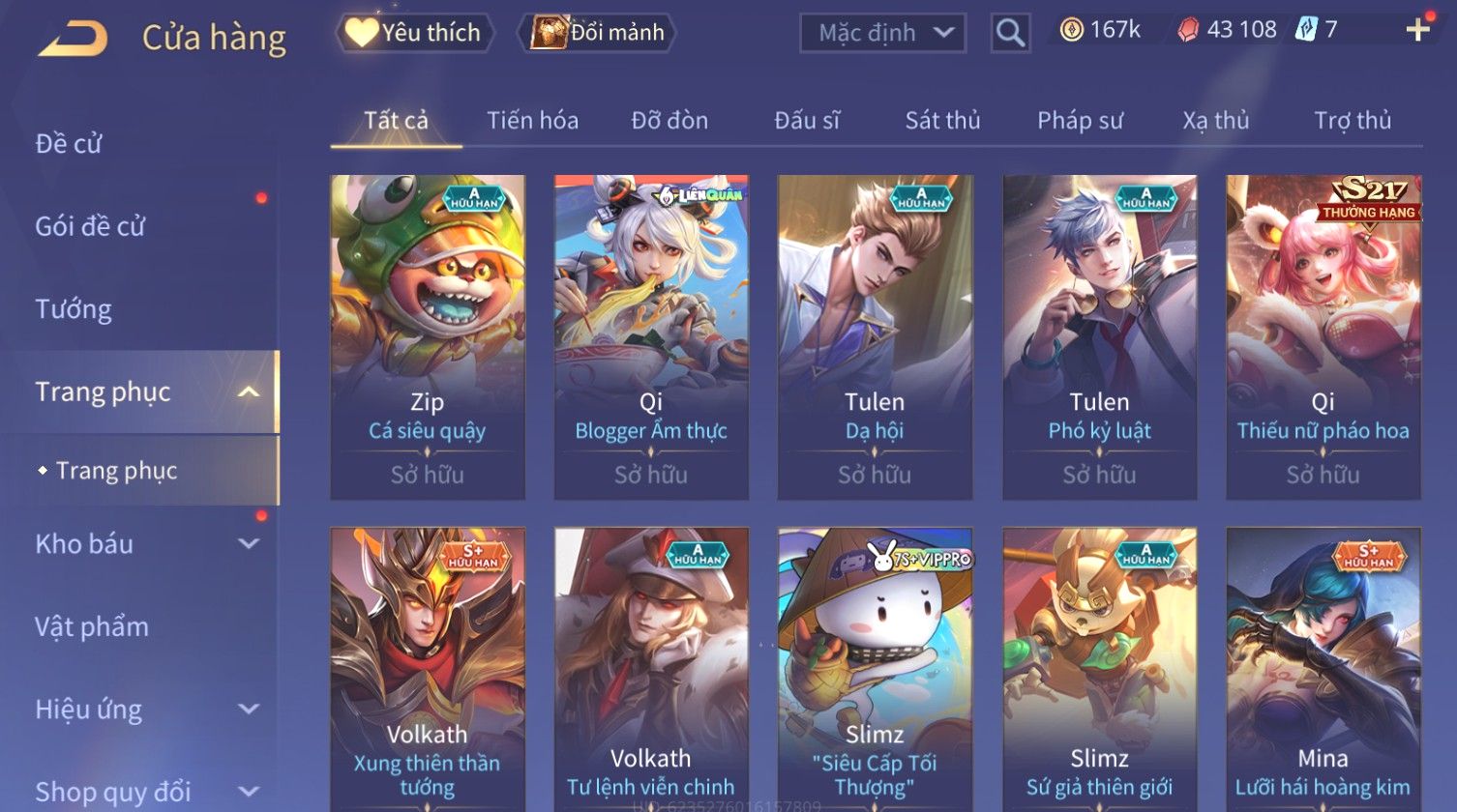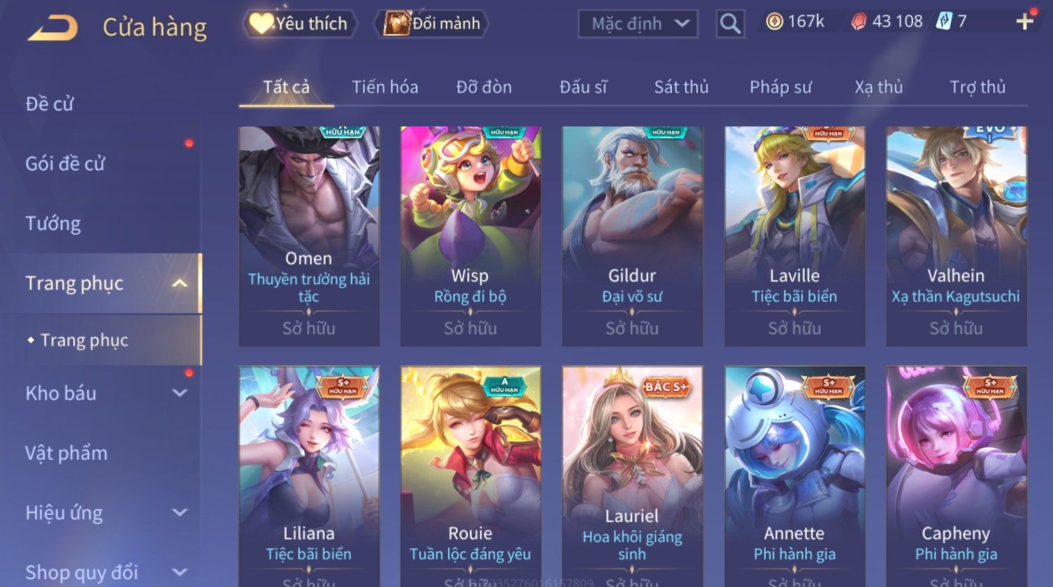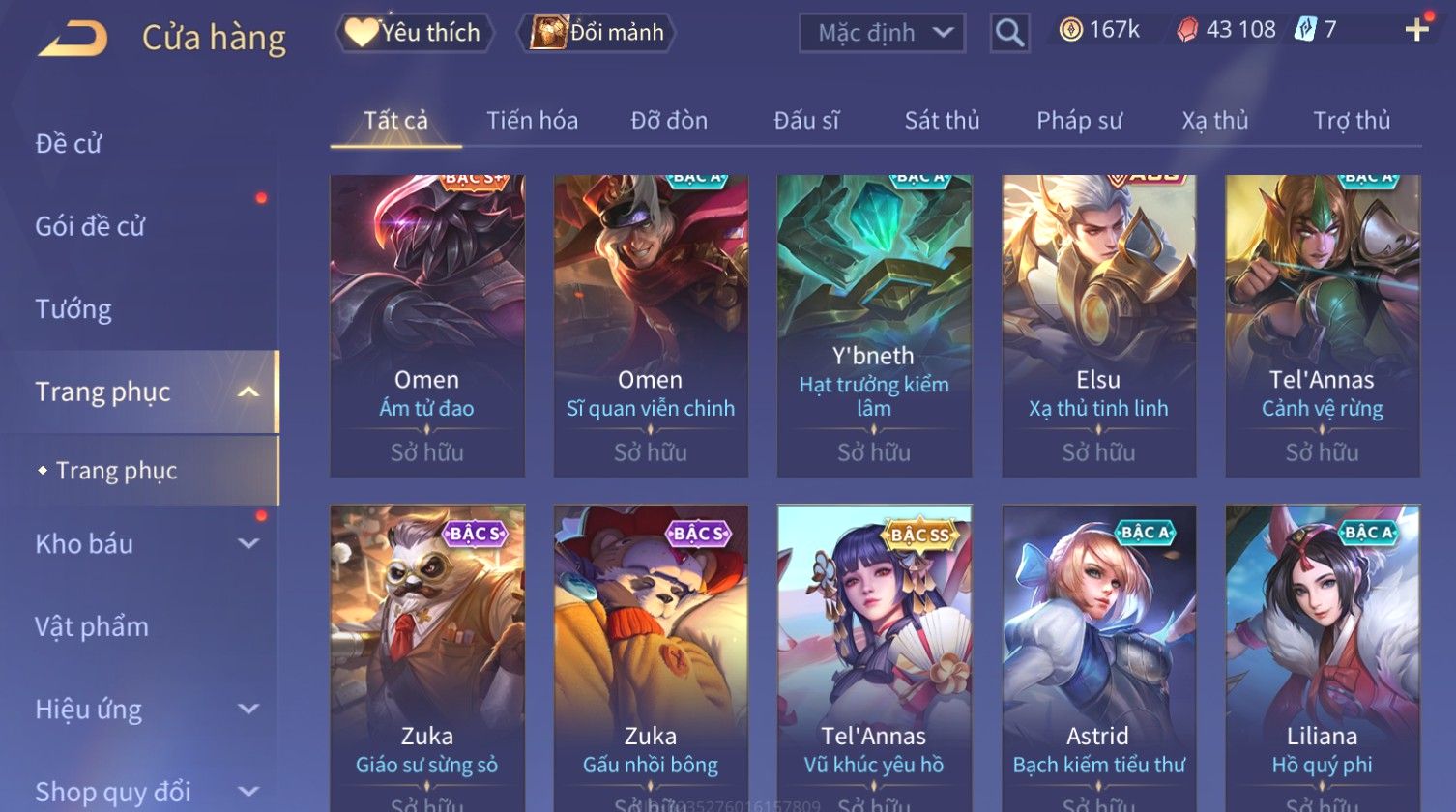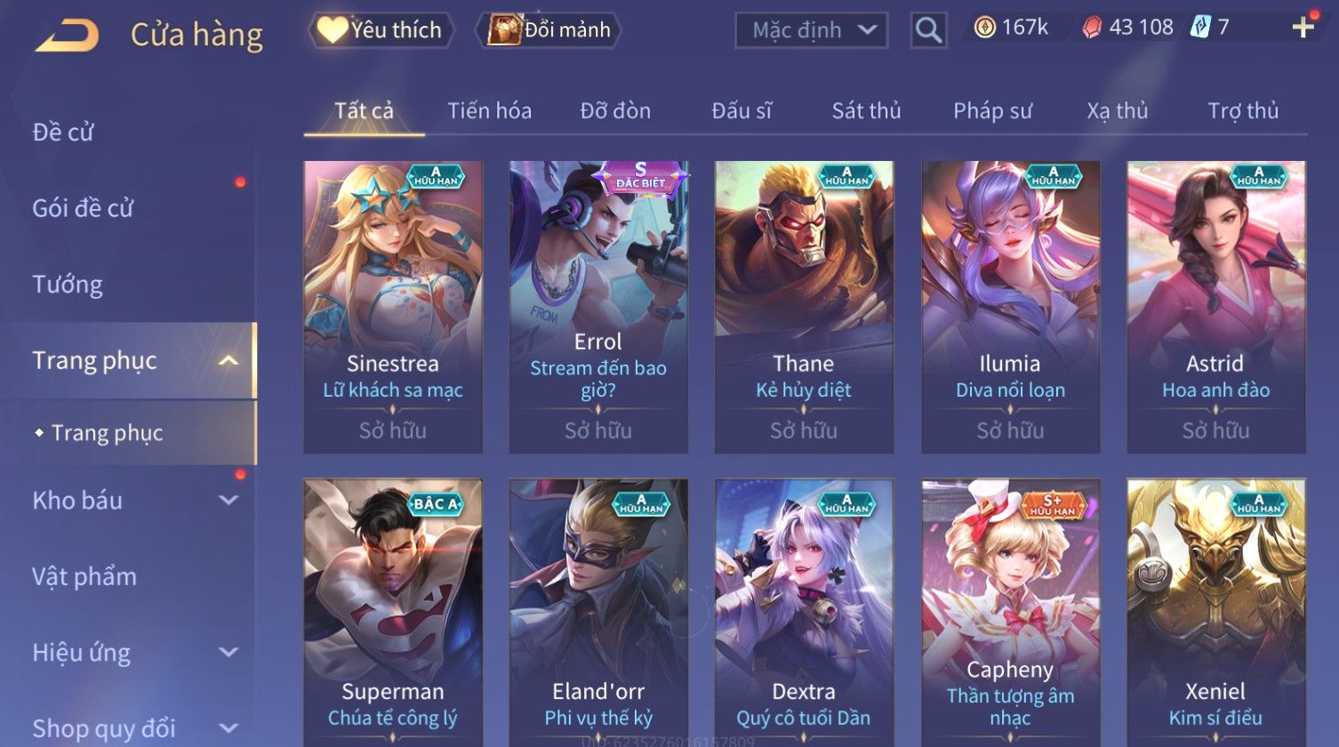 Nổi bật: Skin: Murad Byakuya Kuchiki×Raz Chiến Thần Muay Thái×Raz Siêu Việt×Ngộ Không Siêu Việt×Tulen Tiêu Dao Vũ Thần×Tel'Annas Vũ Khúc Yêu Hồ×Valhein Vũ Khí Tối Thượng×Richter Thần Kiếm Susanoo×Florentino Giám Sát Tinh Hệ×Full Ngọc, Nhiều Skin SS Đẹp