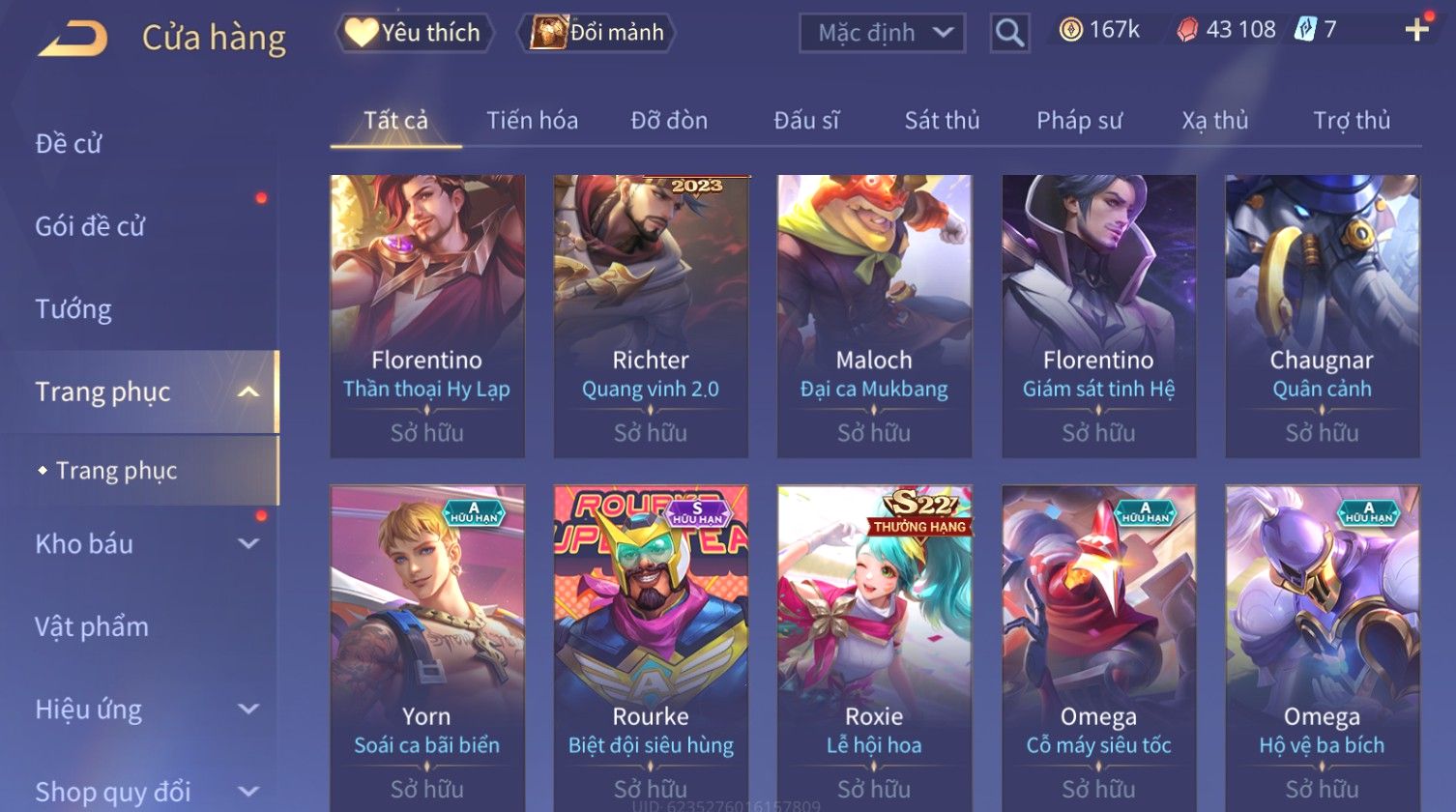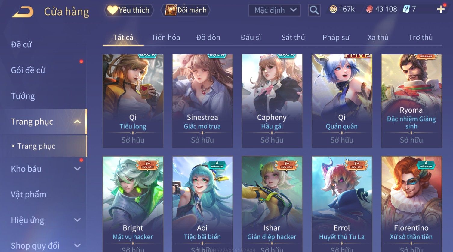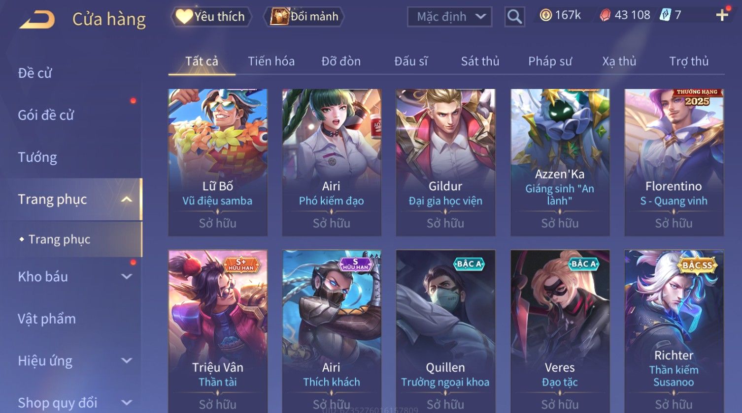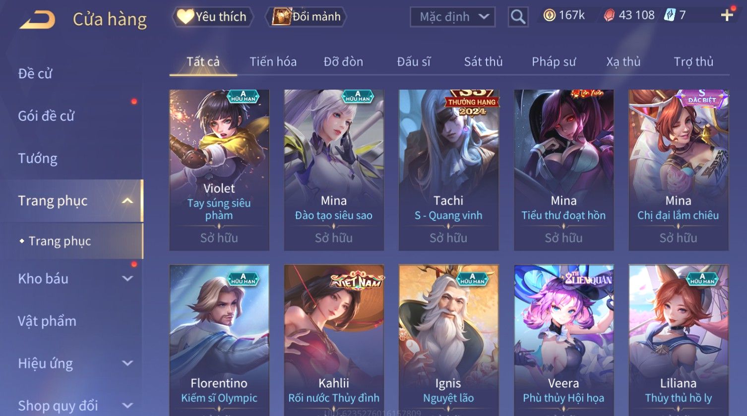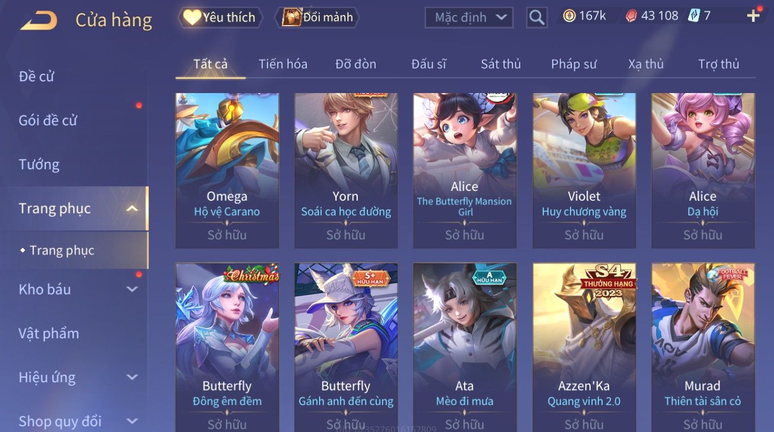 Nổi bật: Skin: Murad Byakuya Kuchiki×Raz Chiến Thần Muay Thái×Raz Siêu Việt×Ngộ Không Siêu Việt×Tulen Tiêu Dao Vũ Thần×Tel'Annas Vũ Khúc Yêu Hồ×Valhein Vũ Khí Tối Thượng×Richter Thần Kiếm Susanoo×Florentino Giám Sát Tinh Hệ×Full Ngọc, Nhiều Skin SS Đẹp