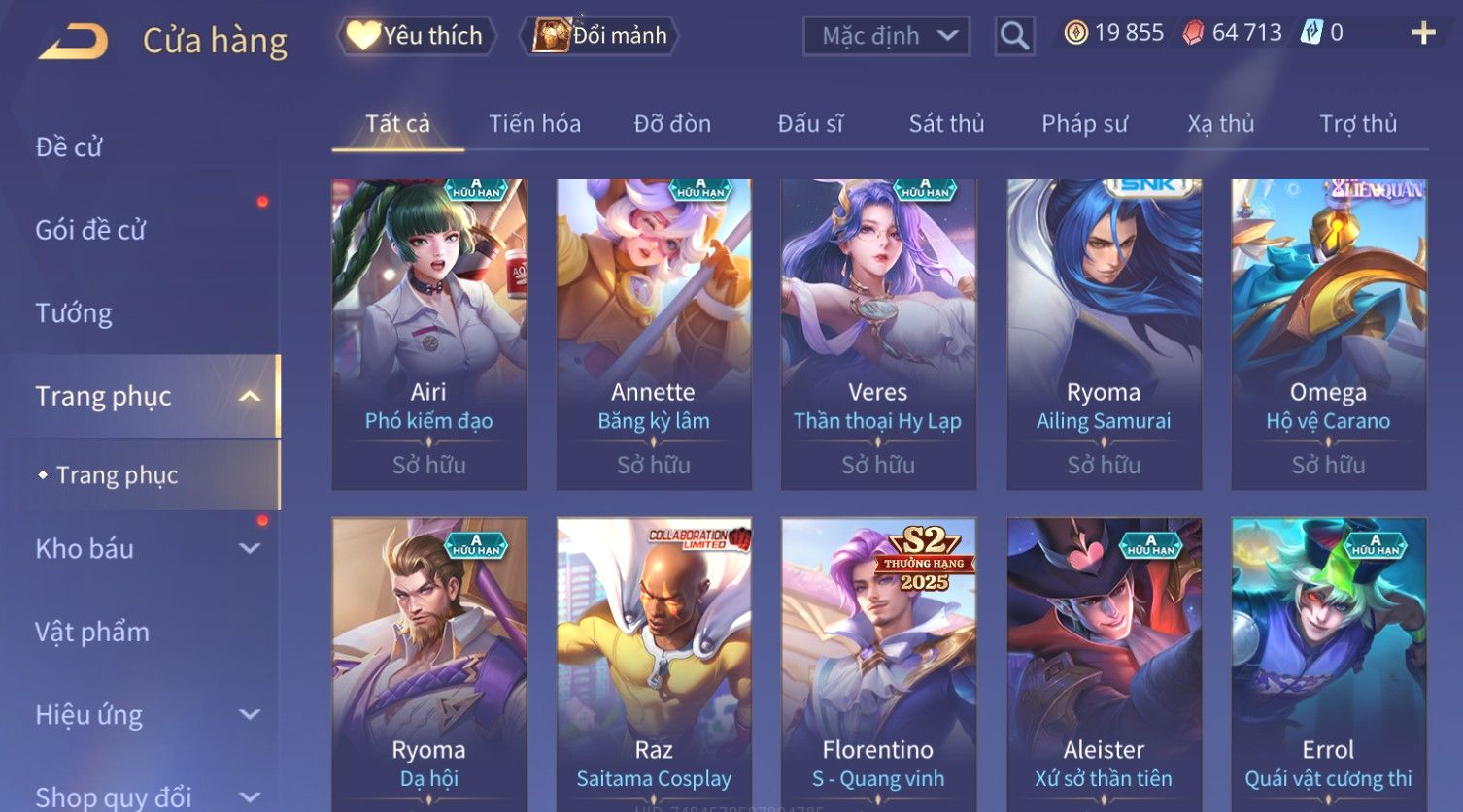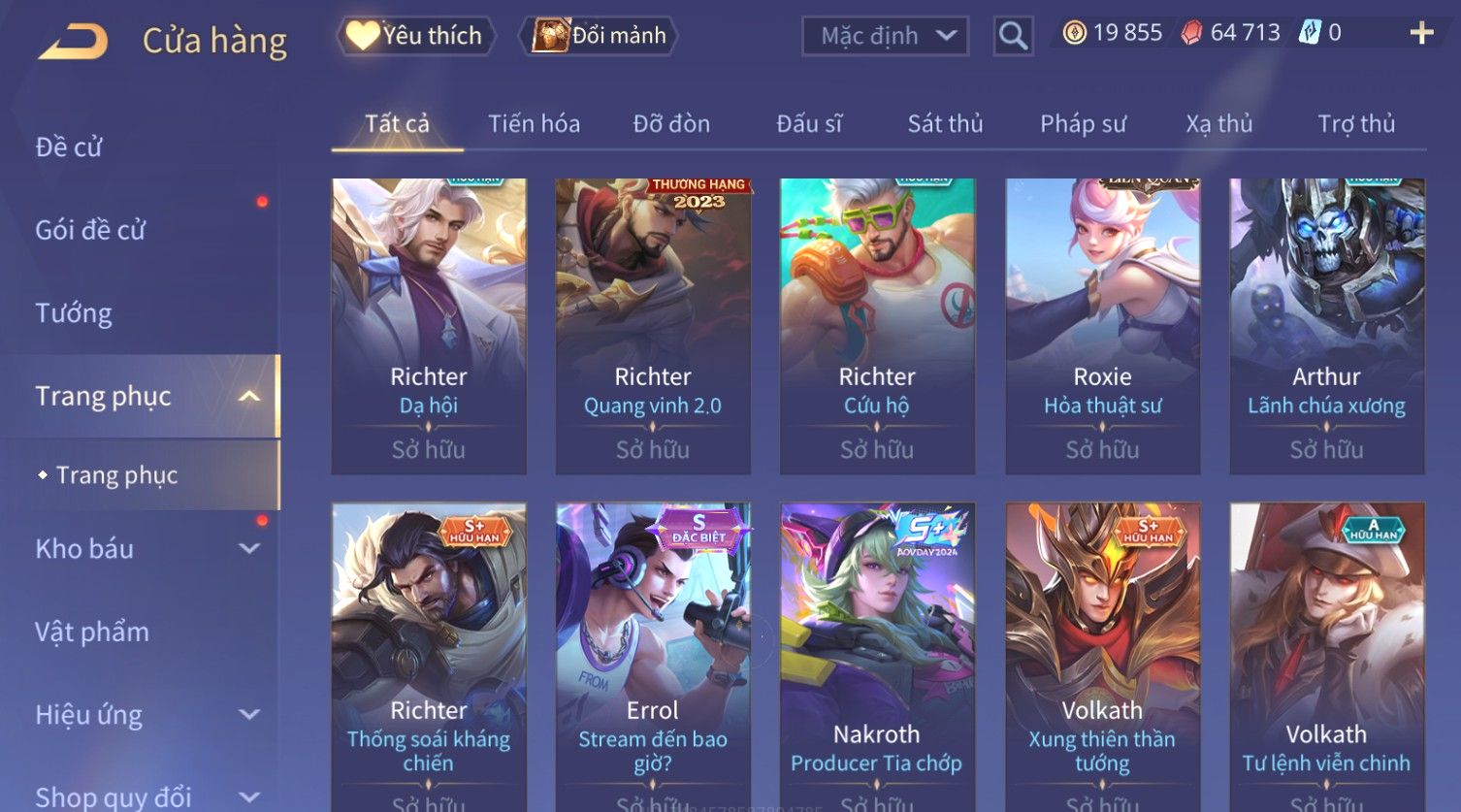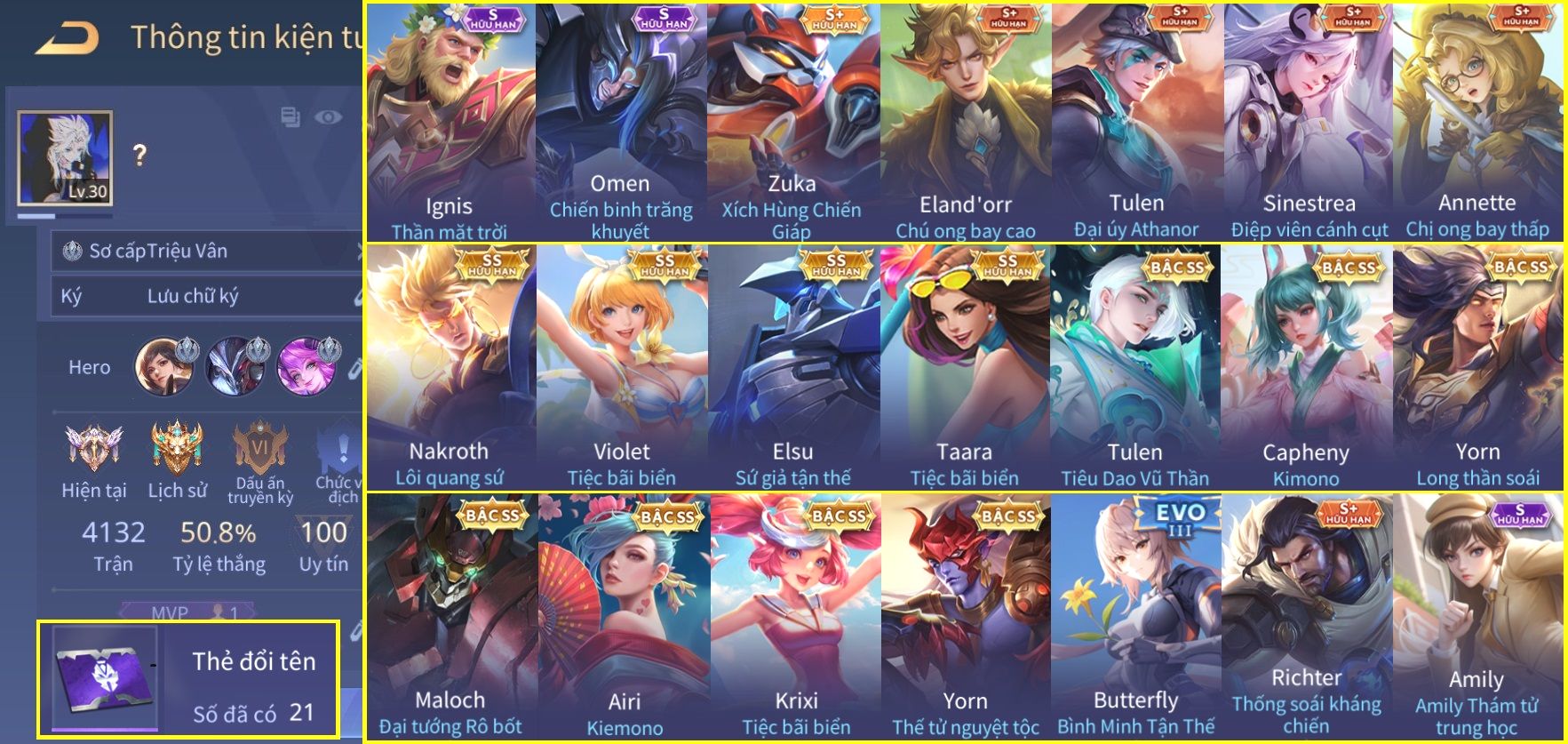 Nổi bật: Skin: Nakroth Lôi Quang Sứ×Violet Tiệc Bãi Biển×Elsu Sử Giả Tận Thế×Taara Tiệc Bãi Biển×Tulen Tiêu Dao Vũ Thần×Capheny Kimono×Yorn Long Thần Soái×Maloch Đại Tướng Rô Bốt×Richter Thống Soái Kháng Chiến×Omen Chiến Binh Trăng Khuyết×Full Ngọc, Nhiều Skin SS Đẹp
