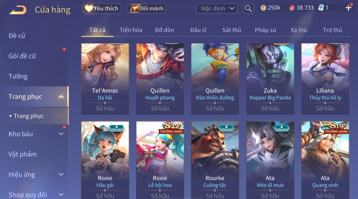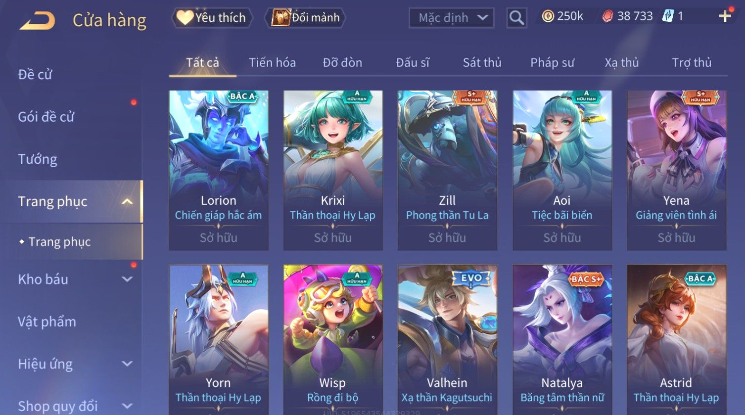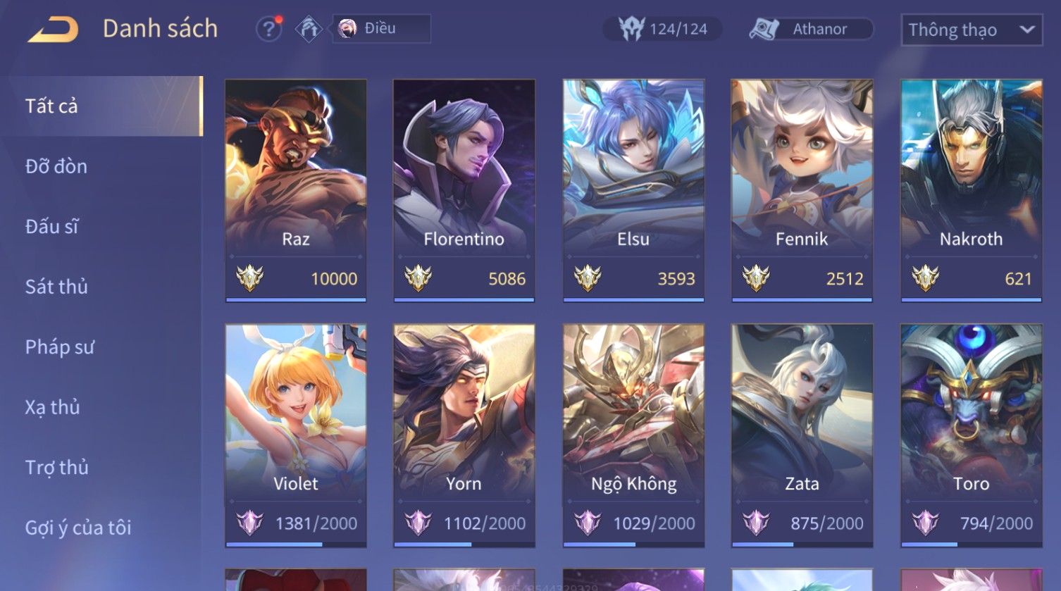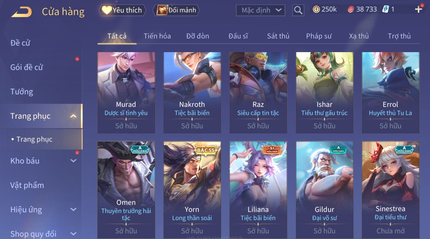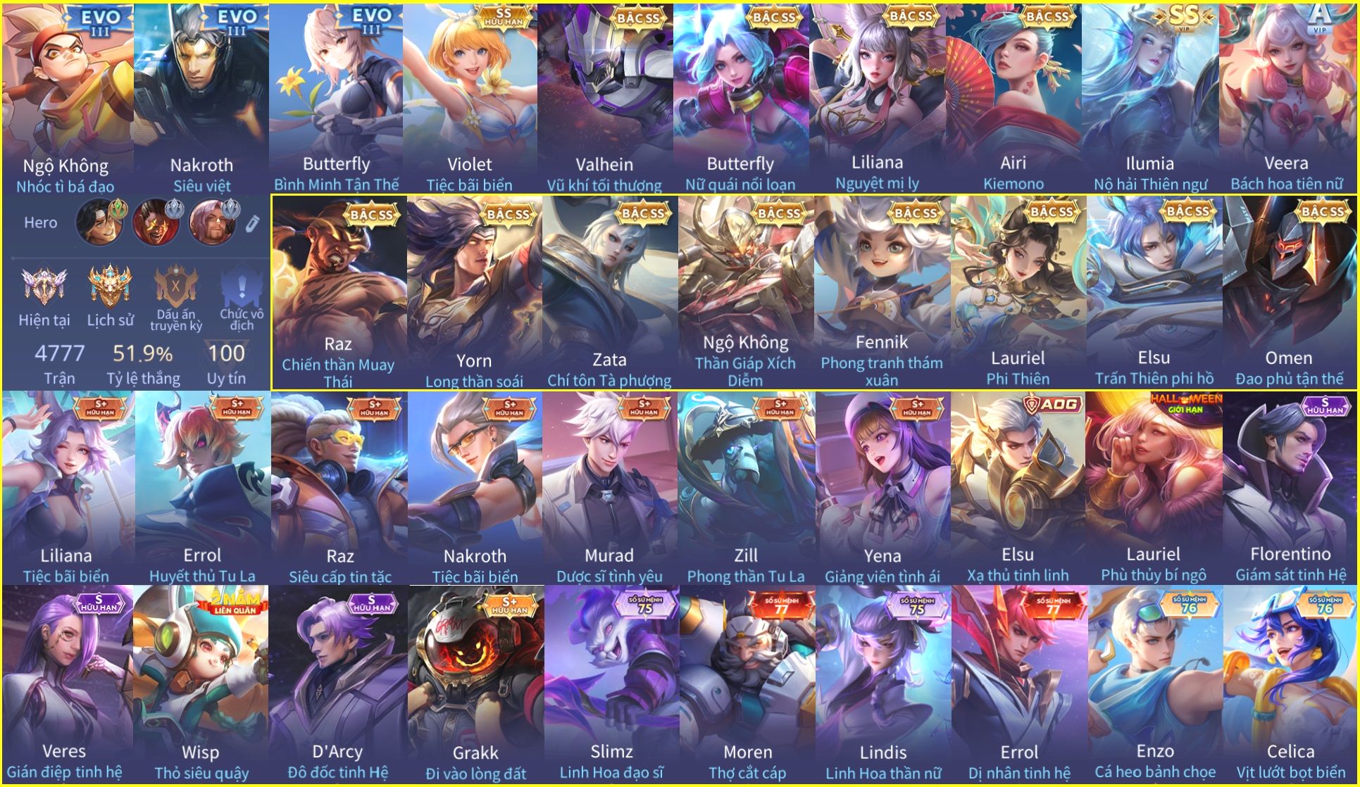 Nổi bật: Skin: Raz Chiến Thần Muay Thái×Yorn Long Thần Soái×Zata Chí Tôn Tà Phượng×Ngộ Không Thần Giáp Xích Diễm×Fennik Phong Tranh Thám Xuân×Lauriel Phi Thiên×Elsu Trấn Thiên Phi Hồ×Omen Đao Phủ Tận Thế×Florentino Giám Sát Tinh Hệ×Ilumia Nộ Hải Thiên Ngư×Full Ngọc, Nhiều Skin SS Đẹp