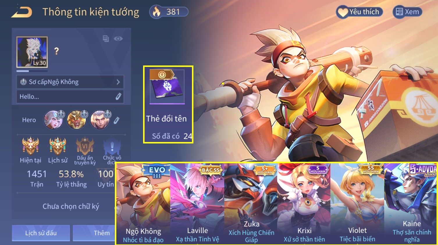 Nổi bật: Skin: Laville Xạ thần Tinh Vệ×Violet Tiệc Bãi Biển×Ngộ Không Nhóc Tì Bá Đạo×Full Ngọc, Nhiều Skin Đẹp
