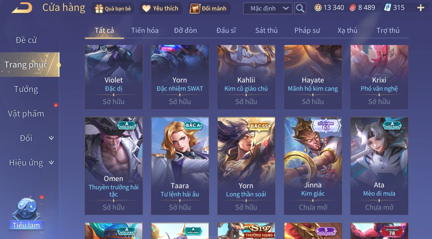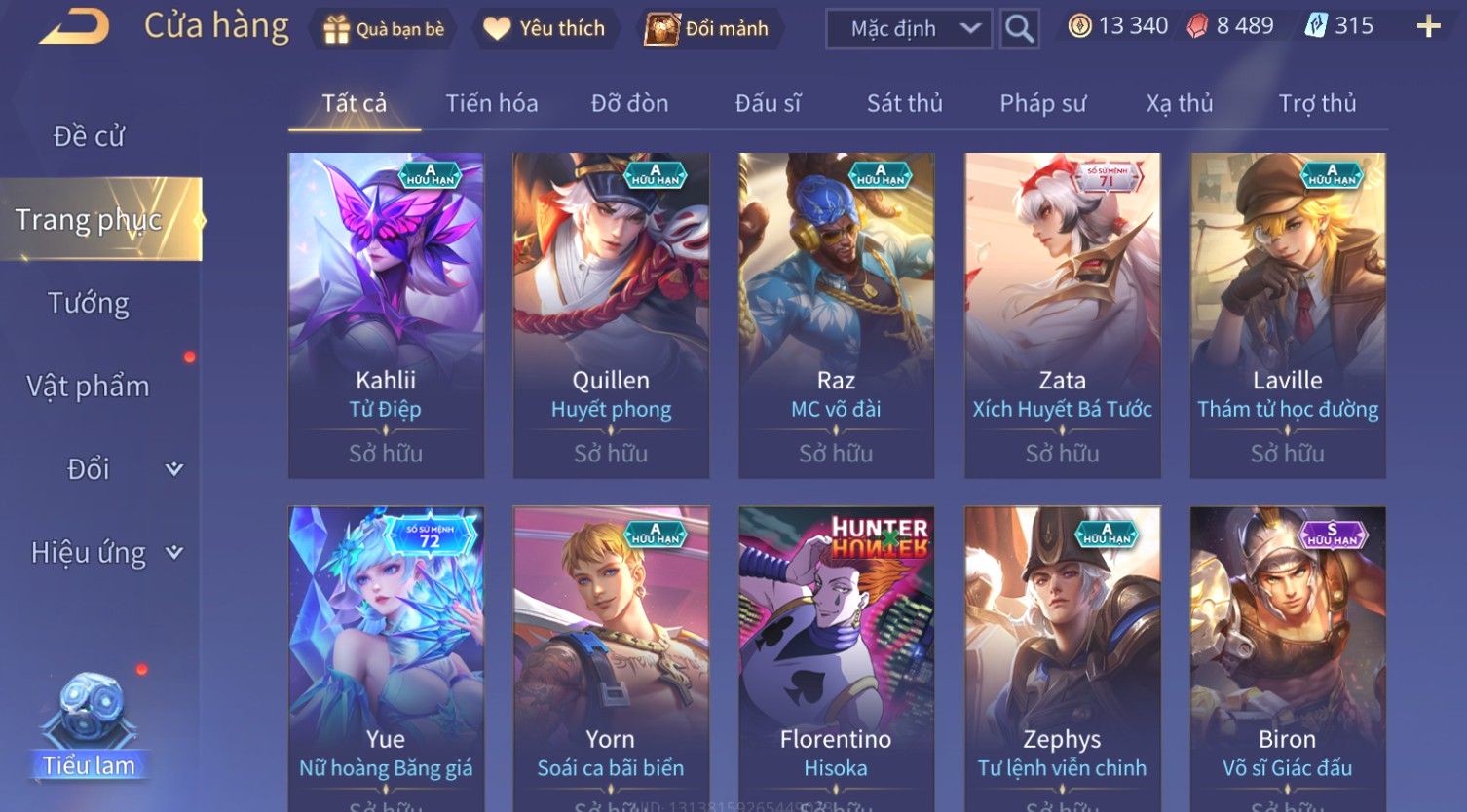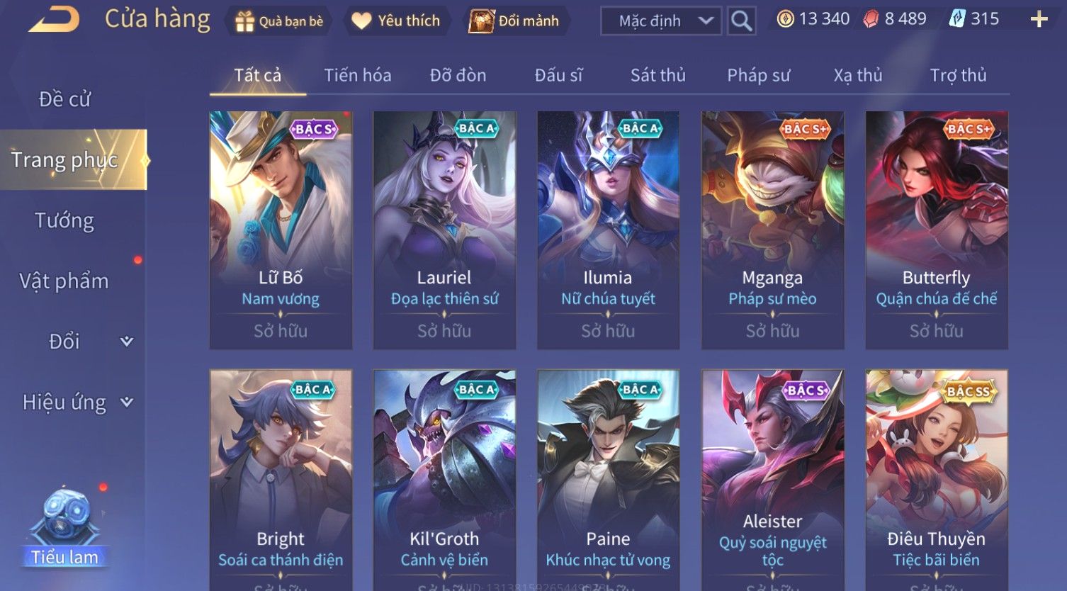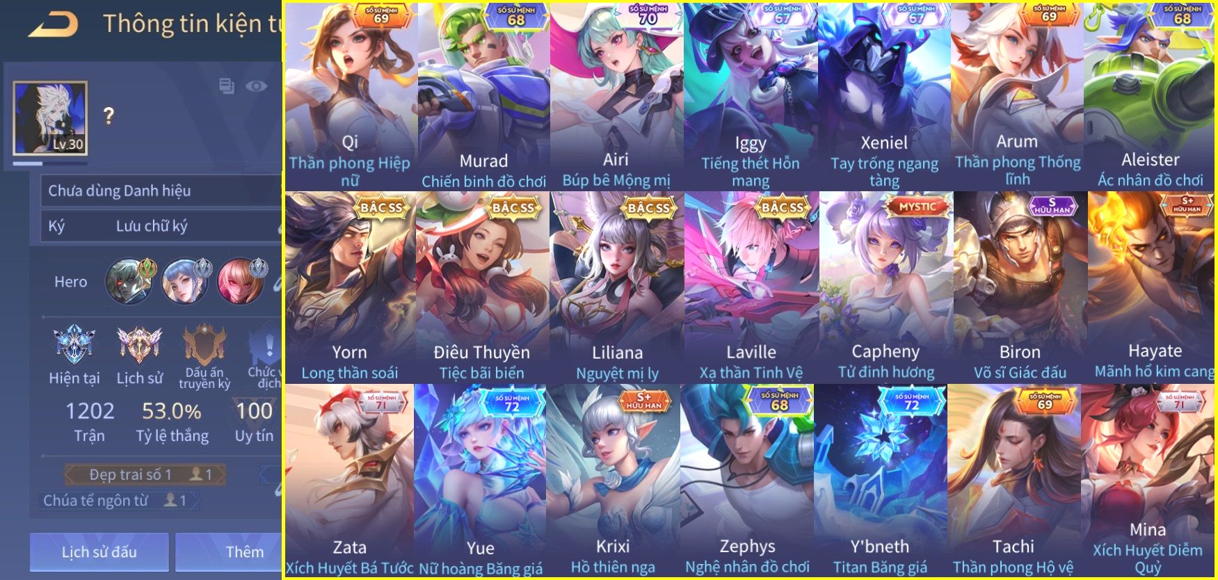 Nổi bật: Skin: Yorn Long Thần Soái×Điêu Thuyền Tiệc Bãi Biển×Liliana Nguyệt Mị Ly×Laville Xạ thần Tinh Vệ×Capheny Tử Đinh Hương×
