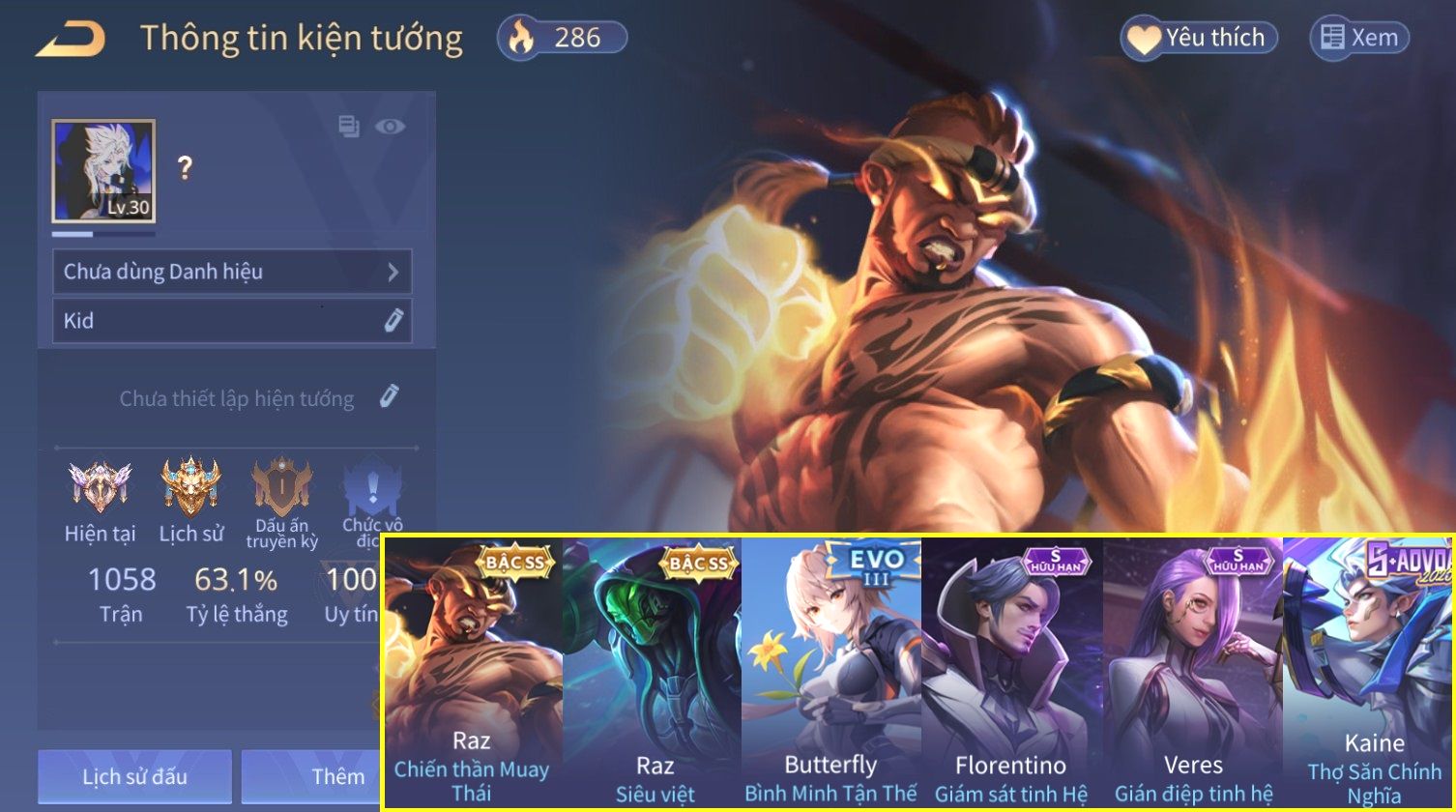 Nổi bật: Skin: Raz Chiến Thần Muay Thái×Raz Siêu Việt×Florentino Giám Sát Tinh Hệ×Veres Gián Điệp Tinh Hệ×