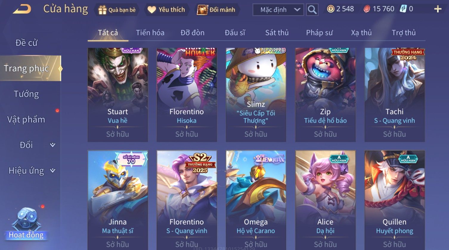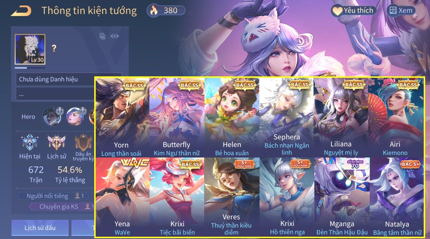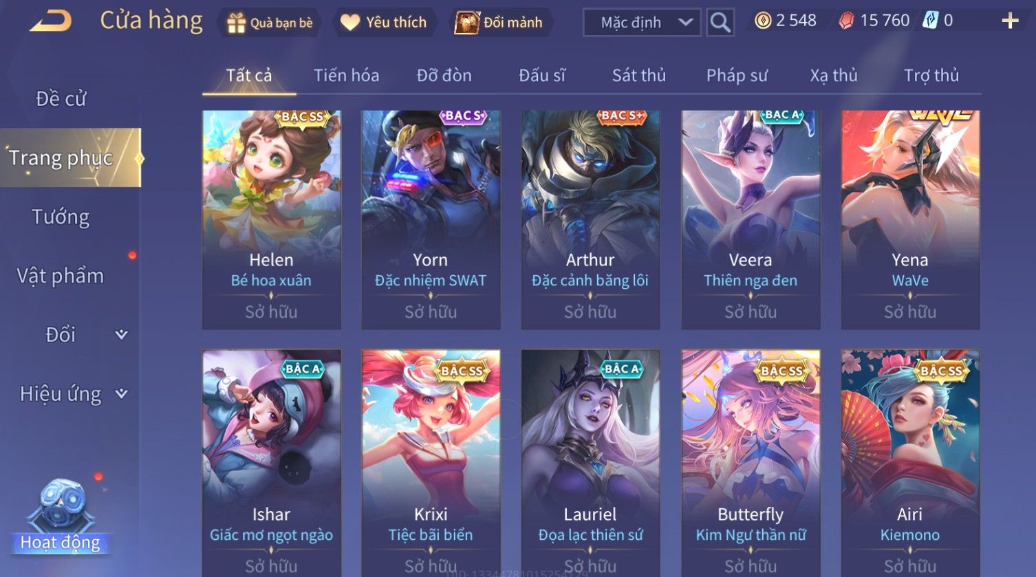 Nổi bật: Skin: Yorn Long Thần Soái×Butterfly Kim Ngư Thần Nữ×Helen Bé hoa xuân×Sephera ×Yena WaVe×