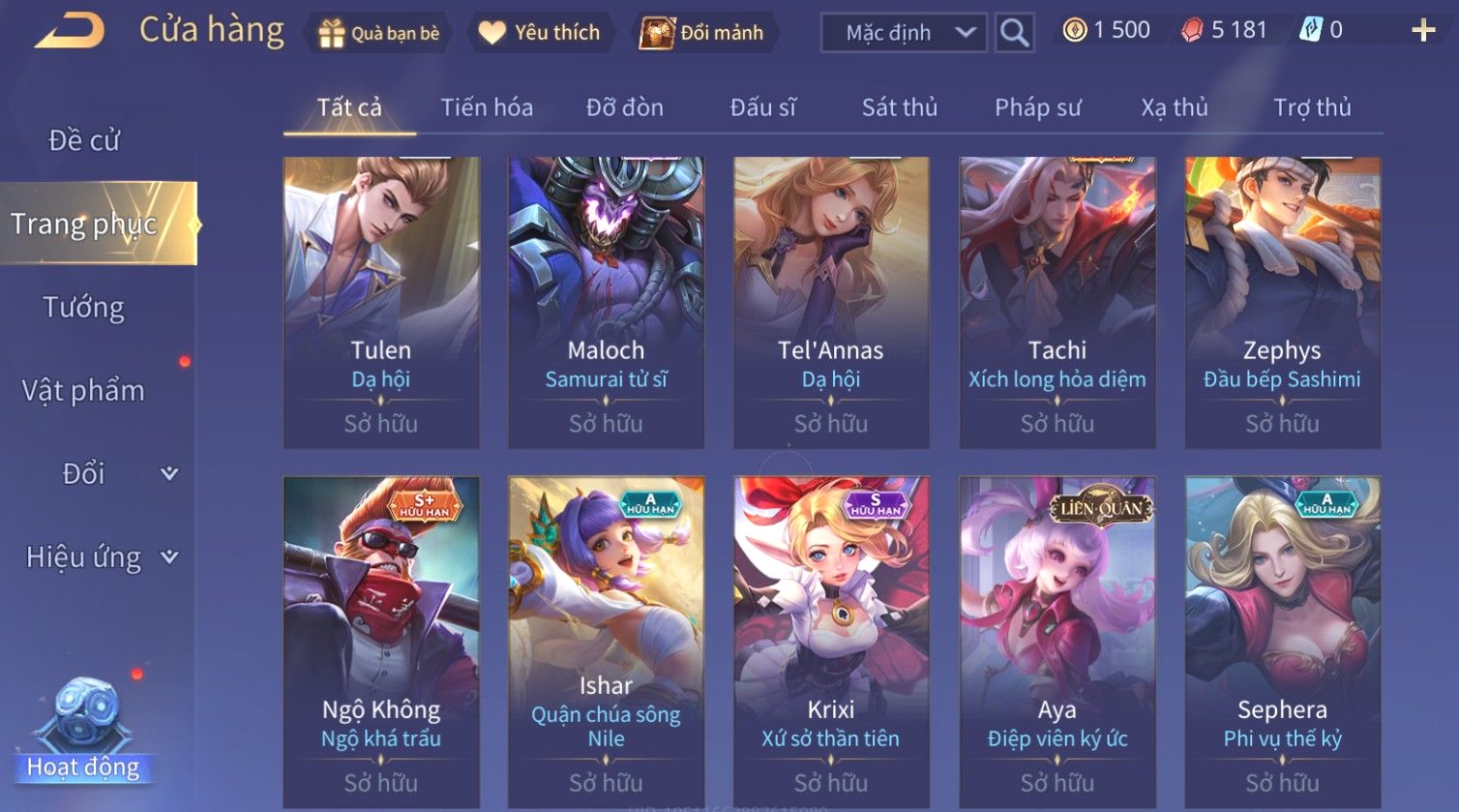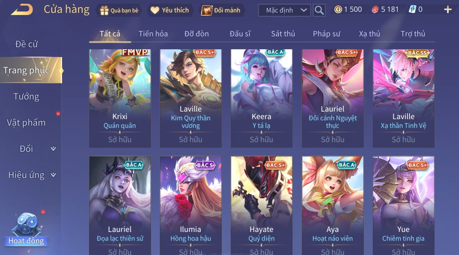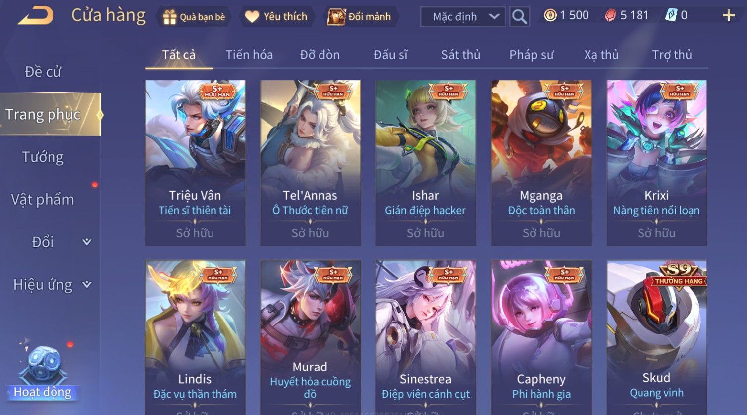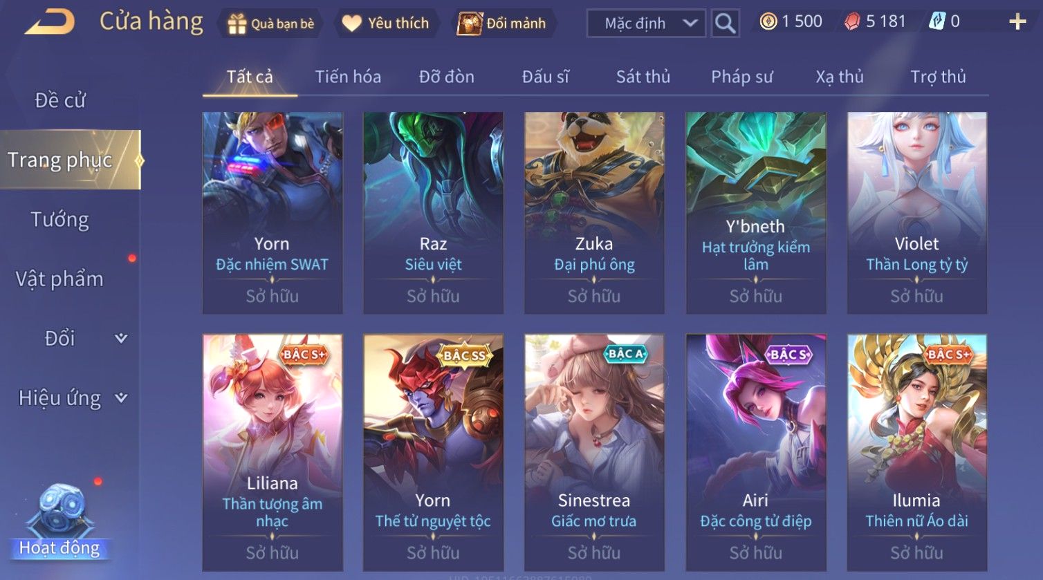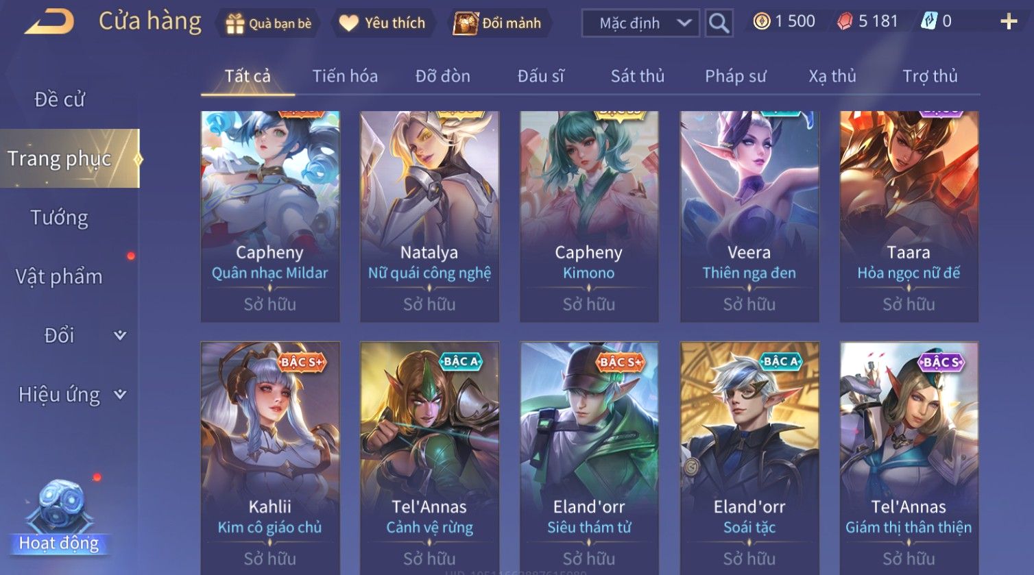Nổi bật: Skin: Liliana Tân Nguyệt Mị Ly×Lauriel Thiên Sứ Công Nghệ×Richter Thần Kiếm Susanoo×Omen Đao Phủ Tận Thế×Capheny Kimono×Ngộ Không Siêu Việt×Raz Siêu Việt×Violet Thần Long Tỷ Tỷ×Dextra Băng Sa Công Chúa×Laville Xạ thần Tinh Vệ×Elsu Guitar Tình Ái×Hayate Mãnh Hổ Kim Cang×Yue - Vũ Phiếm Hỏa Diệm×Paine Ô Thước Đại Hiệp×Tel'Annas Ô Thước Tiên Nữ×