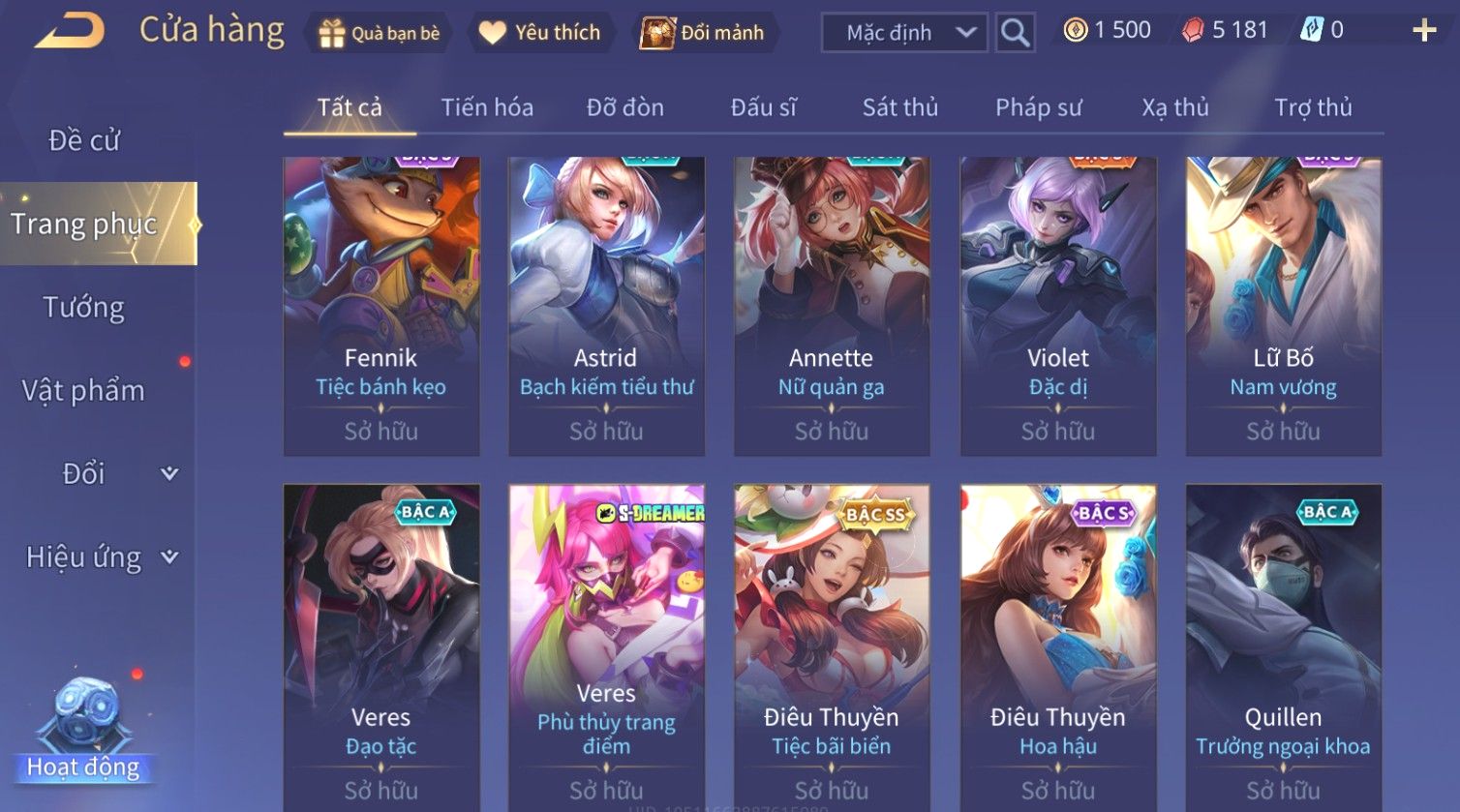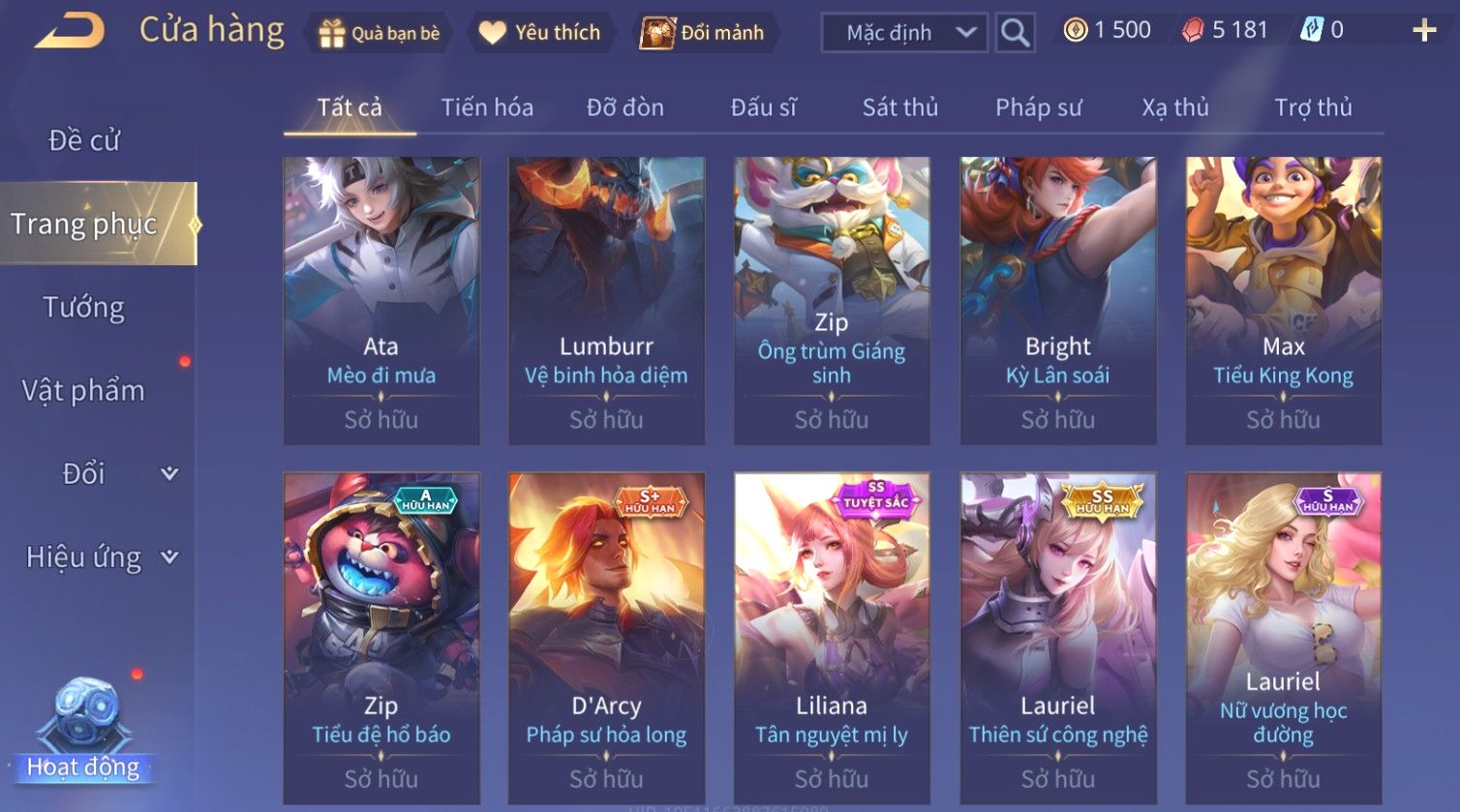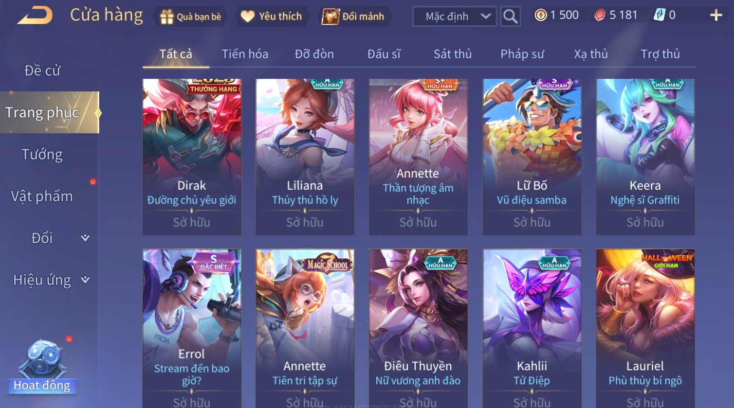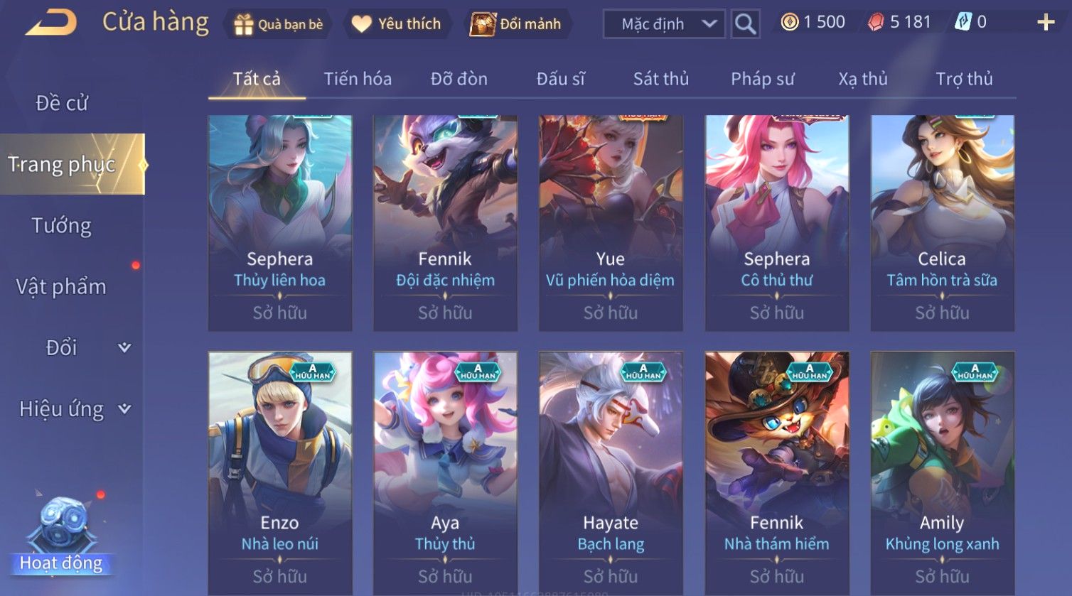 Nổi bật: Skin: Liliana Tân Nguyệt Mị Ly×Lauriel Thiên Sứ Công Nghệ×Richter Thần Kiếm Susanoo×Omen Đao Phủ Tận Thế×Capheny Kimono×Ngộ Không Siêu Việt×Raz Siêu Việt×Violet Thần Long Tỷ Tỷ×Dextra Băng Sa Công Chúa×Laville Xạ thần Tinh Vệ×Elsu Guitar Tình Ái×Hayate Mãnh Hổ Kim Cang×Yue - Vũ Phiếm Hỏa Diệm×Paine Ô Thước Đại Hiệp×Tel'Annas Ô Thước Tiên Nữ×