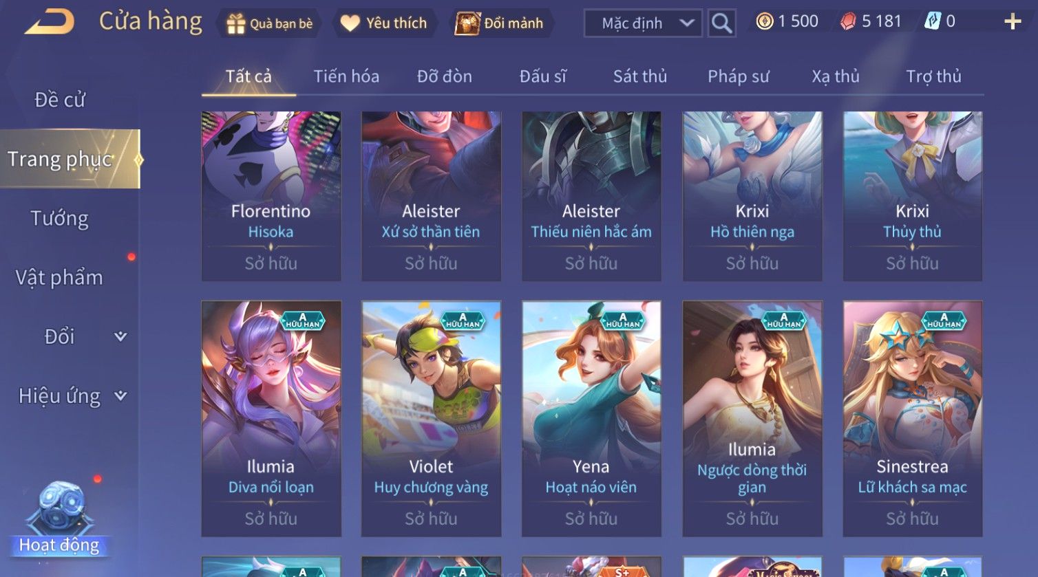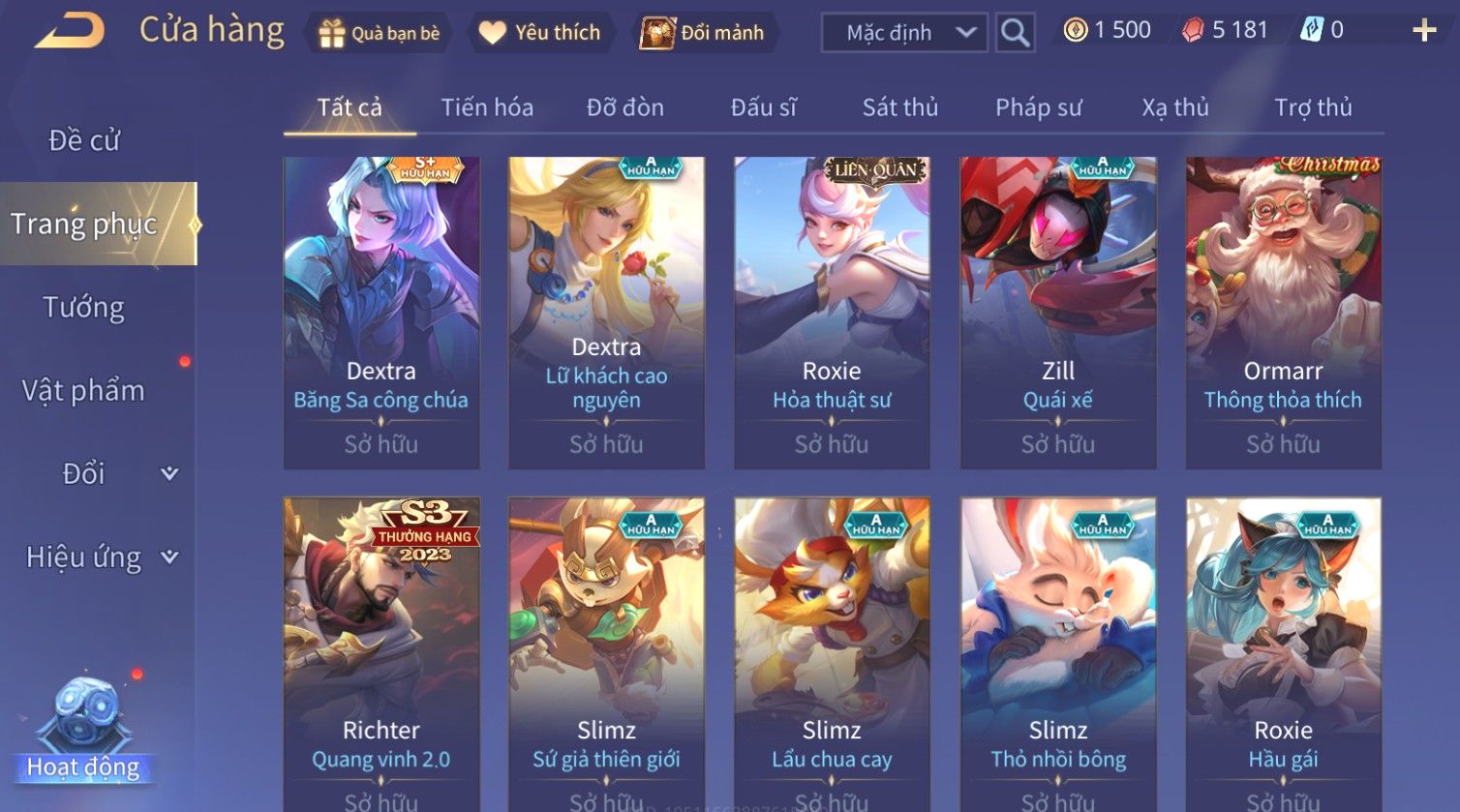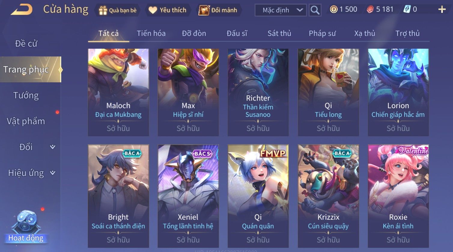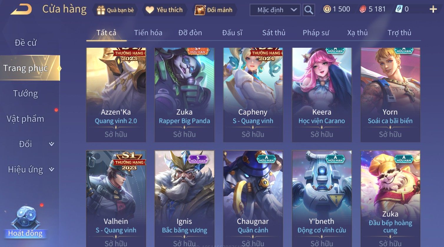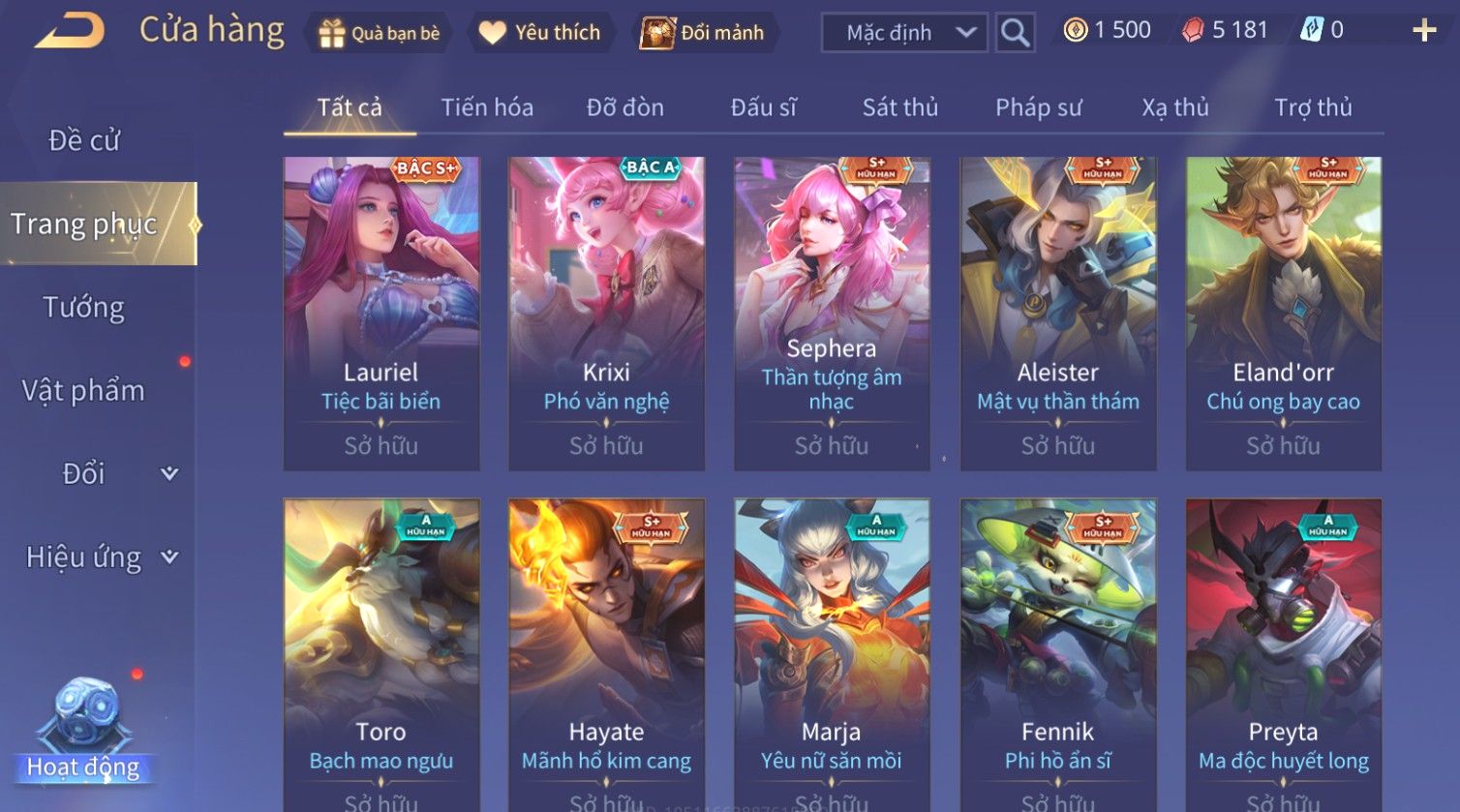 Nổi bật: Skin: Liliana Tân Nguyệt Mị Ly×Lauriel Thiên Sứ Công Nghệ×Richter Thần Kiếm Susanoo×Omen Đao Phủ Tận Thế×Capheny Kimono×Ngộ Không Siêu Việt×Raz Siêu Việt×Violet Thần Long Tỷ Tỷ×Dextra Băng Sa Công Chúa×Laville Xạ thần Tinh Vệ×Elsu Guitar Tình Ái×Hayate Mãnh Hổ Kim Cang×Yue - Vũ Phiếm Hỏa Diệm×Paine Ô Thước Đại Hiệp×Tel'Annas Ô Thước Tiên Nữ×