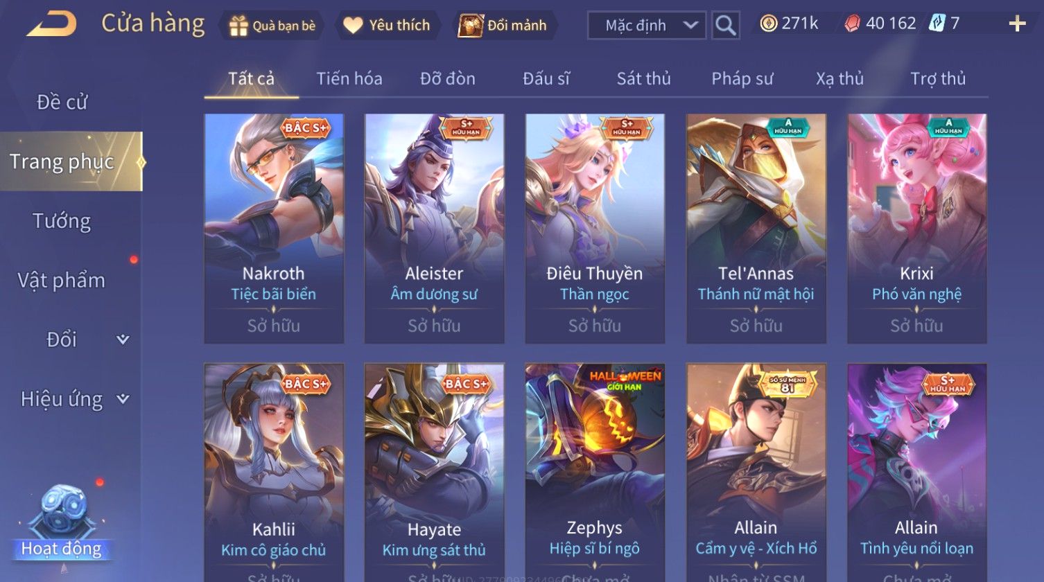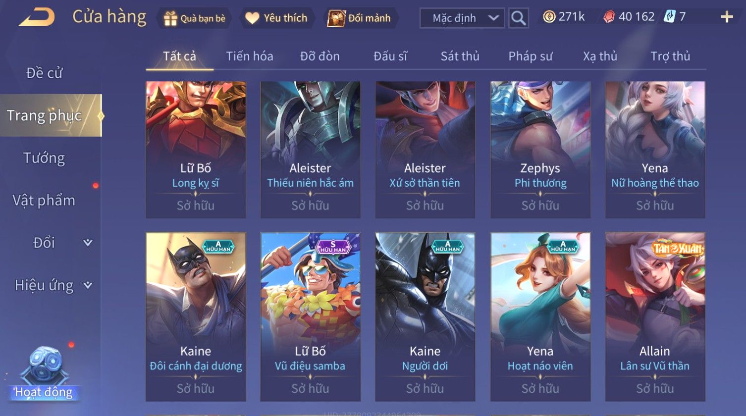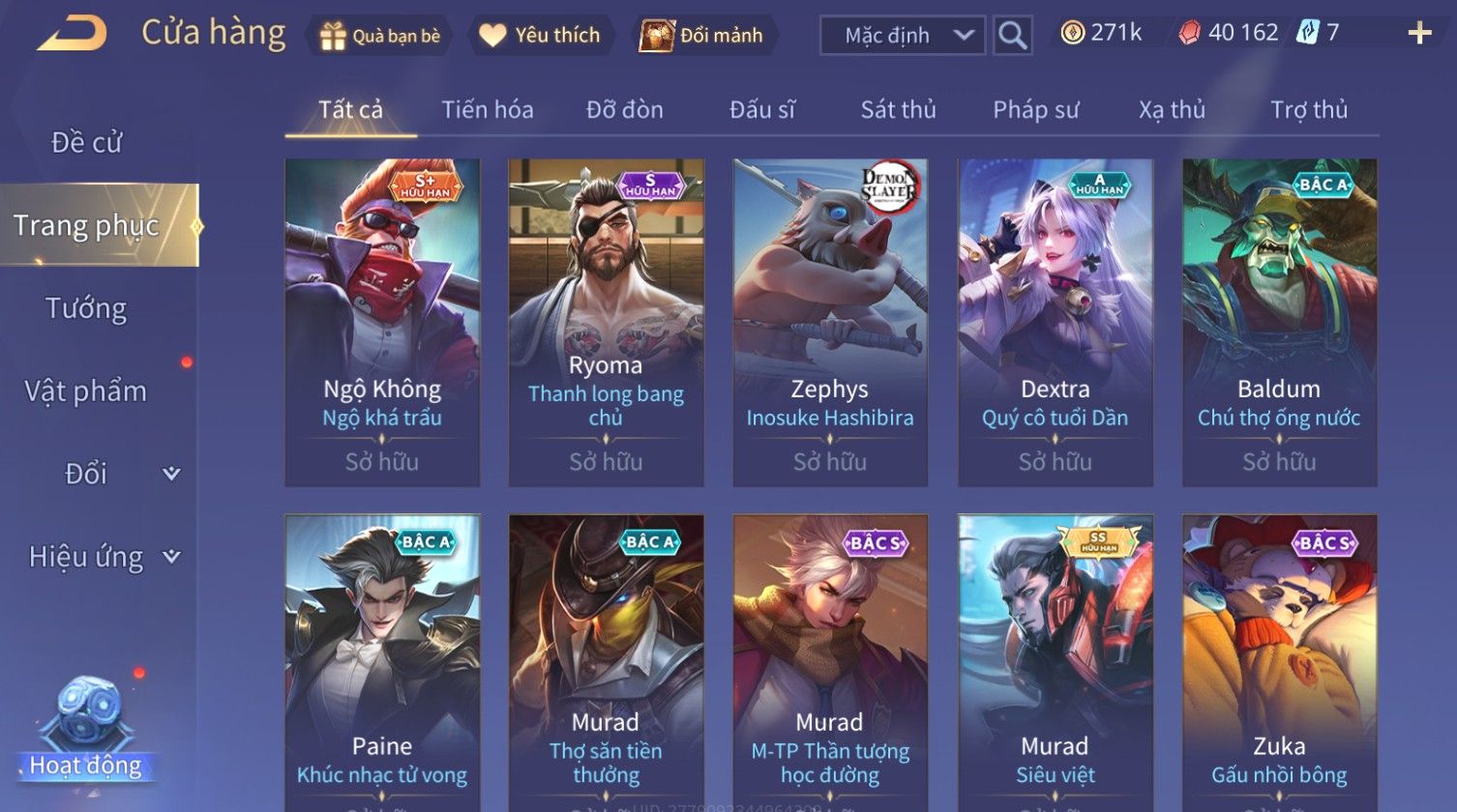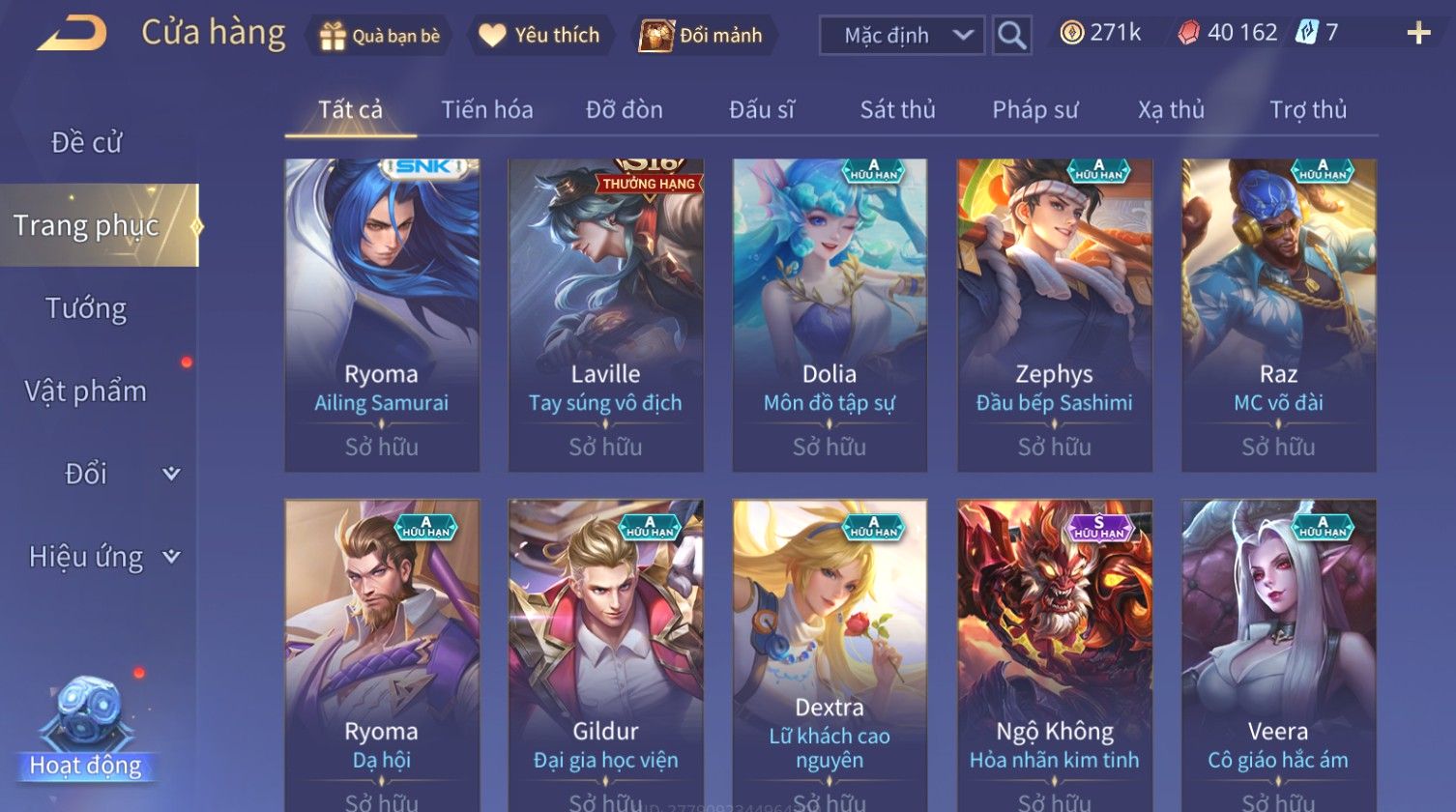 Nổi bật: Skin: Nakroth Lôi Quang Sứ×Murad Chí Tôn Thần Kiếm×Liliana Tiểu Thơ Anh Đào×Ngộ Không Thần Giáp Xích Diễm×Raz Chiến Thần Muay Thái×Violet Thần Long Tỷ Tỷ×Maloch Đại Tướng Rô Bốt×Ryoma Thanh Long Bang Chủ×Cresht Đại Sư Sushi×Full Ngọc, Nhiều Skin SS Đẹp