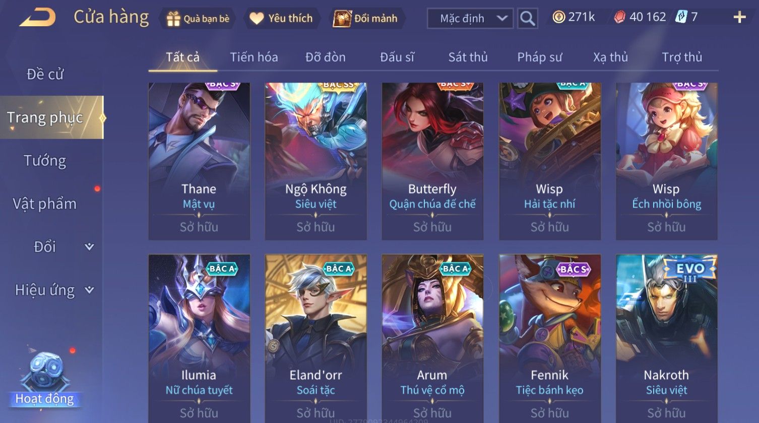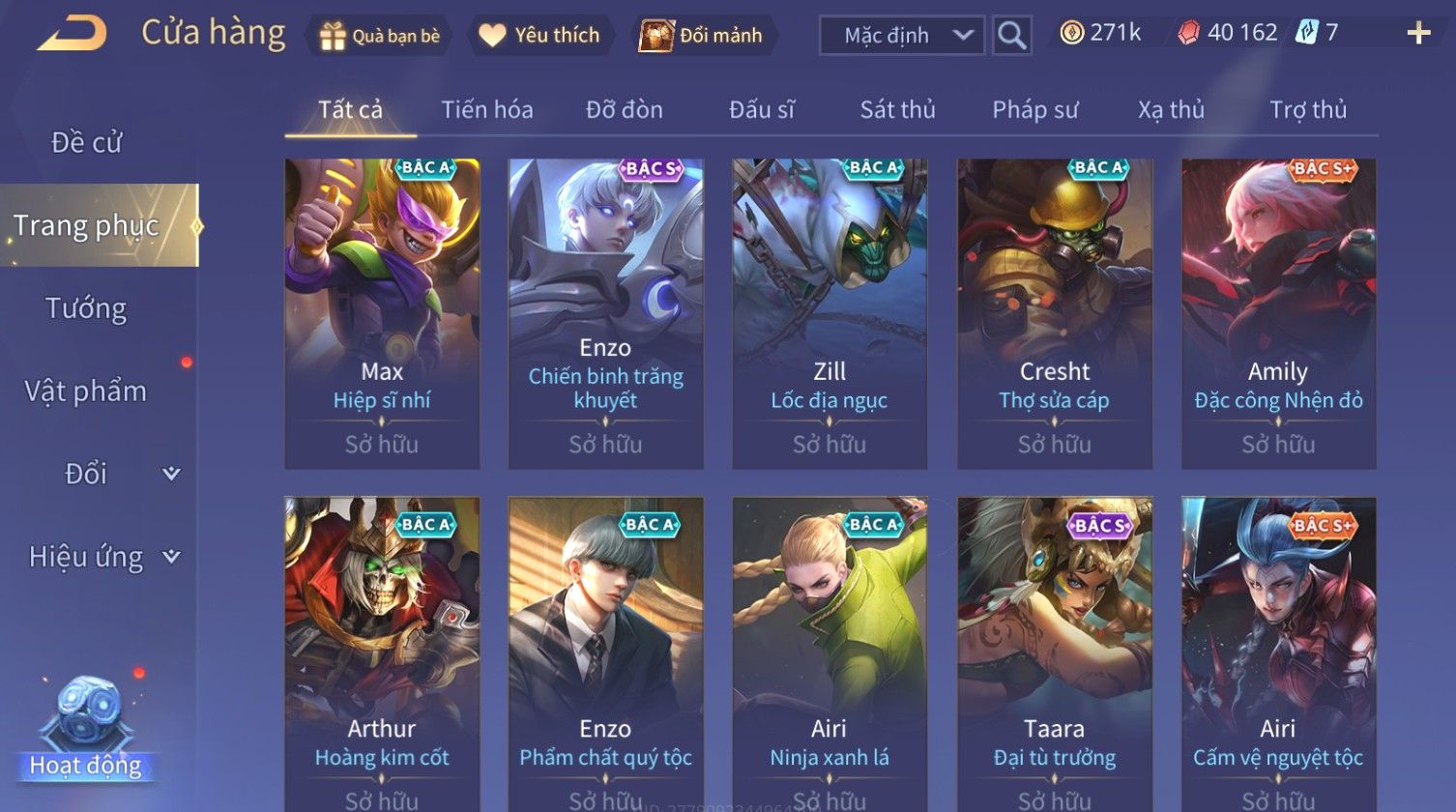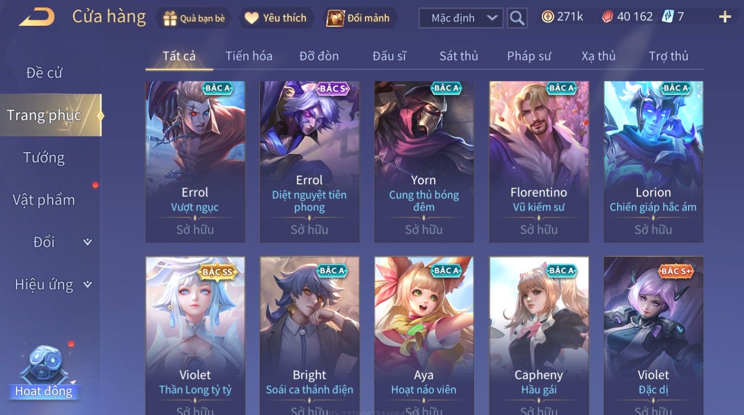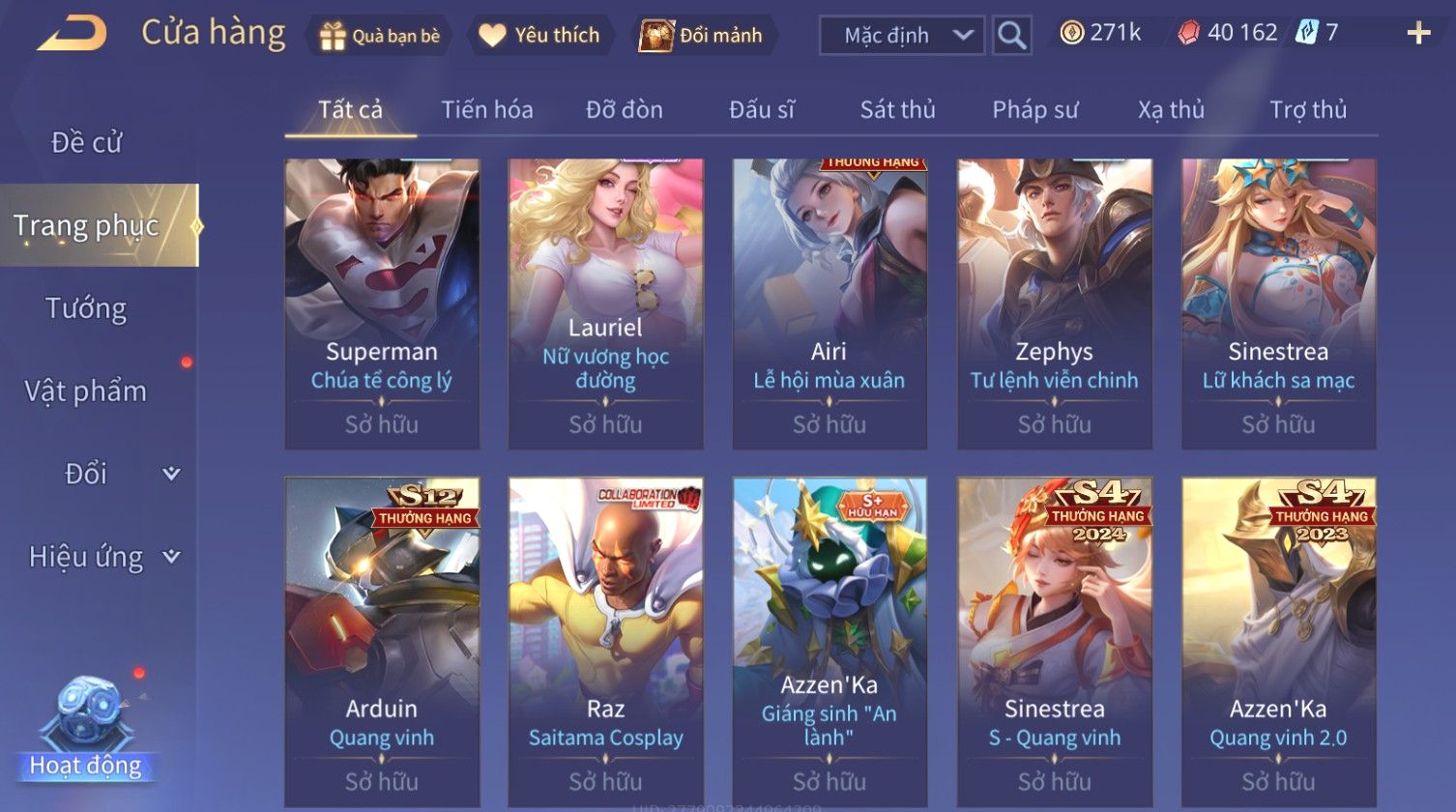 Nổi bật: Skin: Nakroth Lôi Quang Sứ×Murad Chí Tôn Thần Kiếm×Liliana Tiểu Thơ Anh Đào×Ngộ Không Thần Giáp Xích Diễm×Raz Chiến Thần Muay Thái×Violet Thần Long Tỷ Tỷ×Maloch Đại Tướng Rô Bốt×Ryoma Thanh Long Bang Chủ×Cresht Đại Sư Sushi×Full Ngọc, Nhiều Skin SS Đẹp