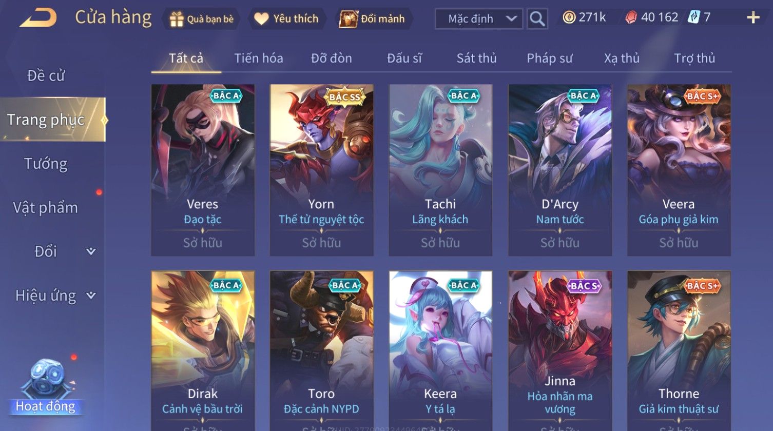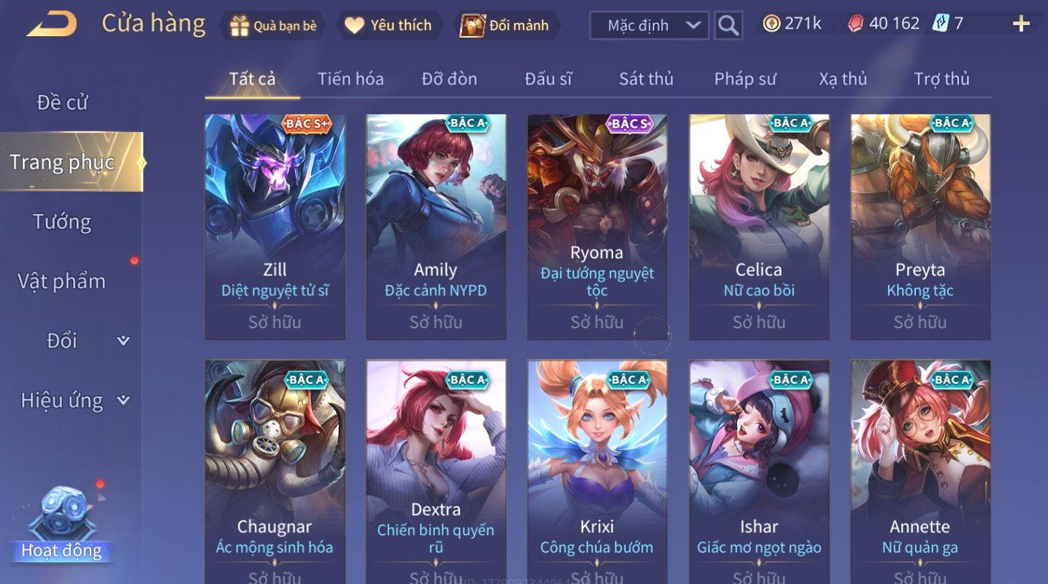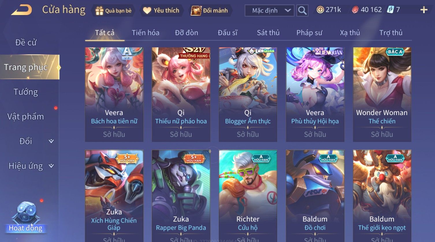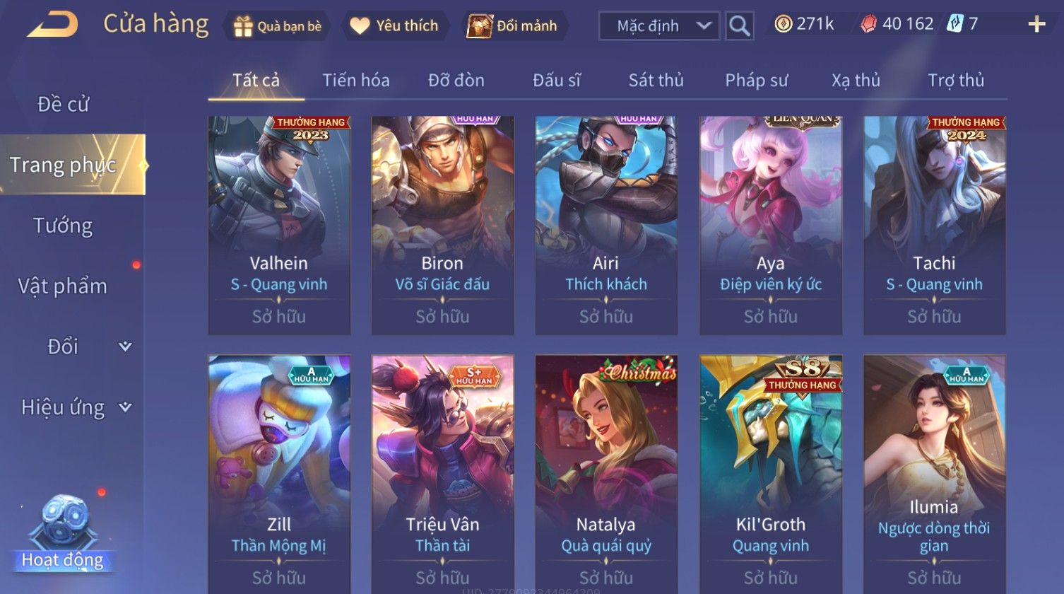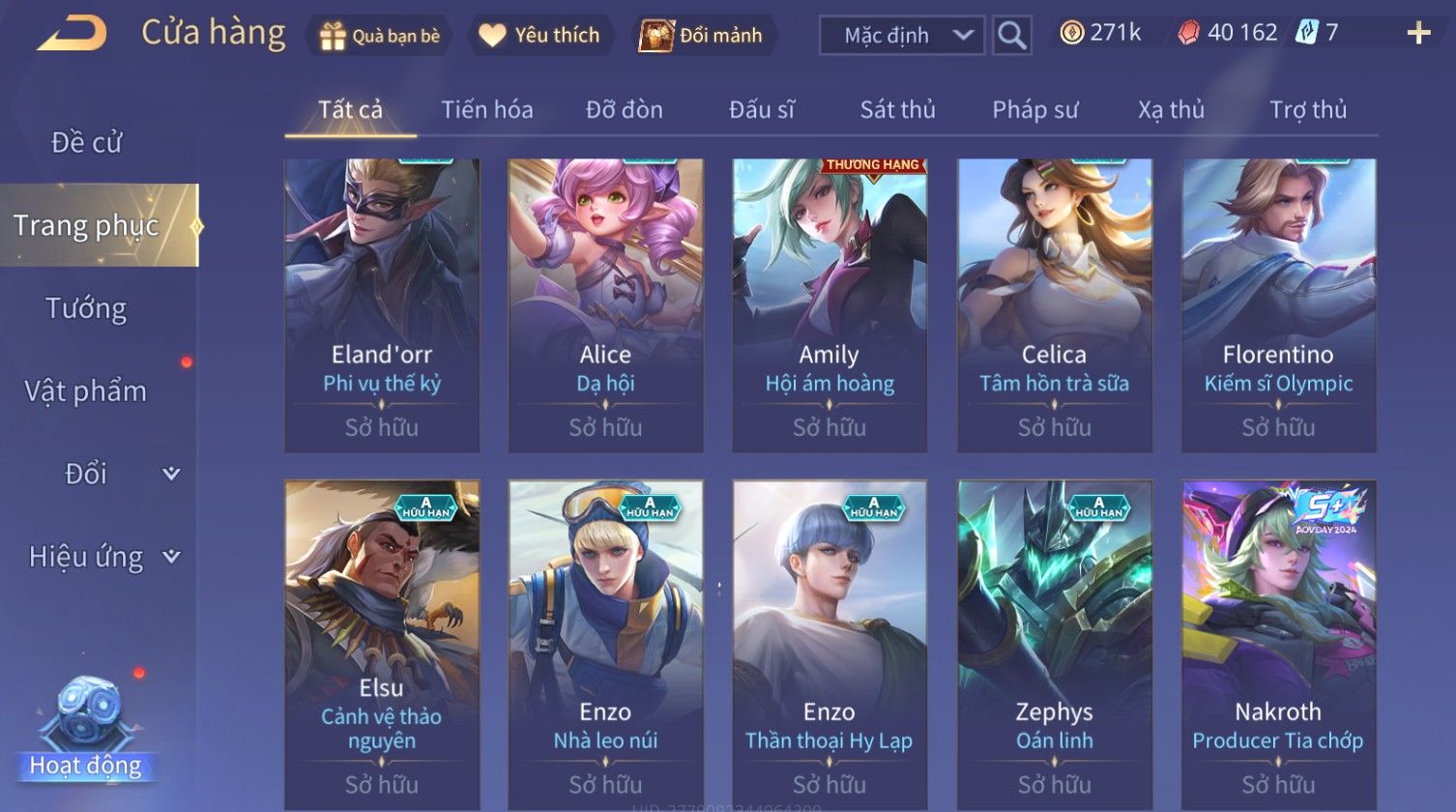 Nổi bật: Skin: Nakroth Lôi Quang Sứ×Murad Chí Tôn Thần Kiếm×Liliana Tiểu Thơ Anh Đào×Ngộ Không Thần Giáp Xích Diễm×Raz Chiến Thần Muay Thái×Violet Thần Long Tỷ Tỷ×Maloch Đại Tướng Rô Bốt×Ryoma Thanh Long Bang Chủ×Cresht Đại Sư Sushi×Full Ngọc, Nhiều Skin SS Đẹp